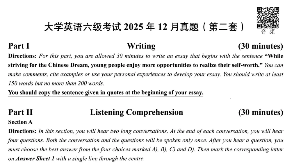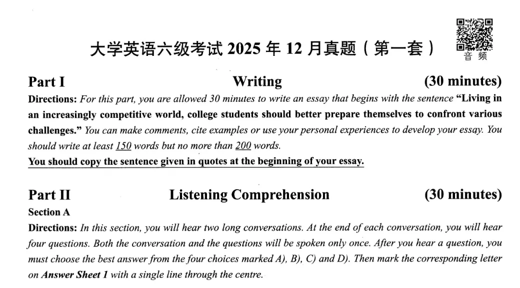 夸克:「2025年12月六级真题+解析+听力(最新)」
