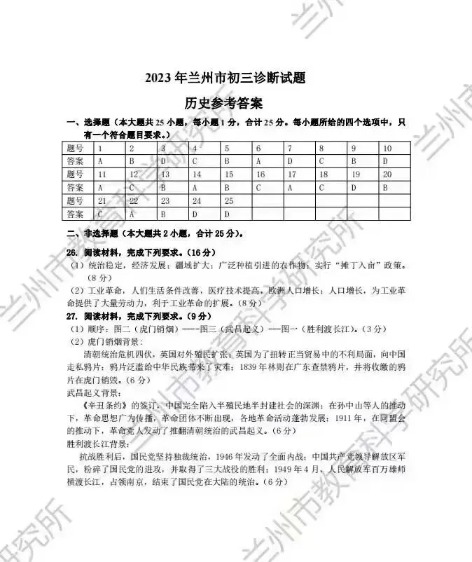 中考模拟┃2023年兰州市中考一诊历史试卷及答案