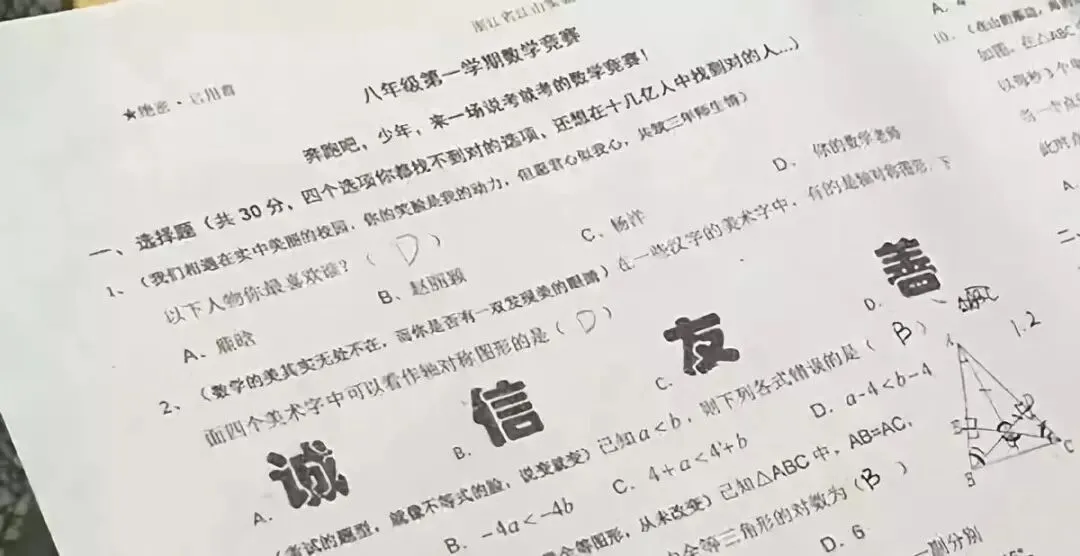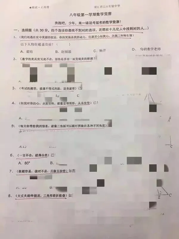 最近,一份八年级的数学竞赛试卷火了。里面每道题都加了一段鸡汤或段子,甚至选择题中还提到了好多孩子都喜欢的当红明星。拿到试卷的孩子们也是在一片笑声中开始答题……