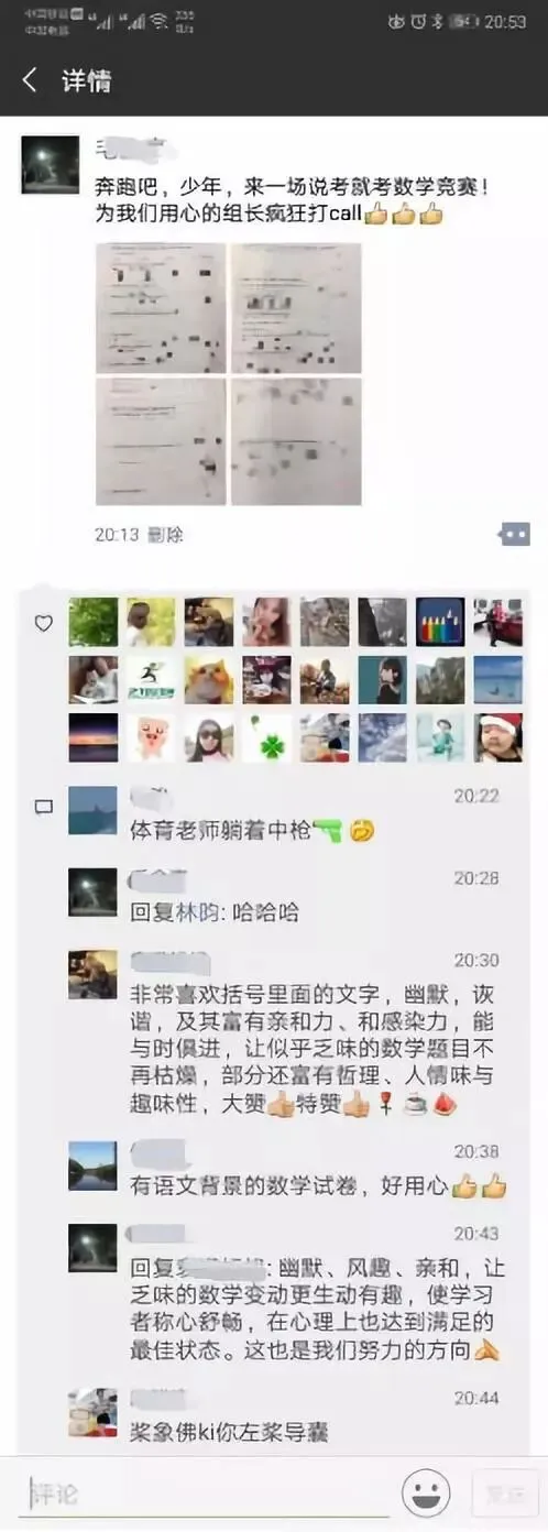 家长黄何倩在朋友圈中写道:“这份试卷抓住了00后孩子最关心的话题,语数结合,连我都有兴趣做题,老师最懂孩子的心。”