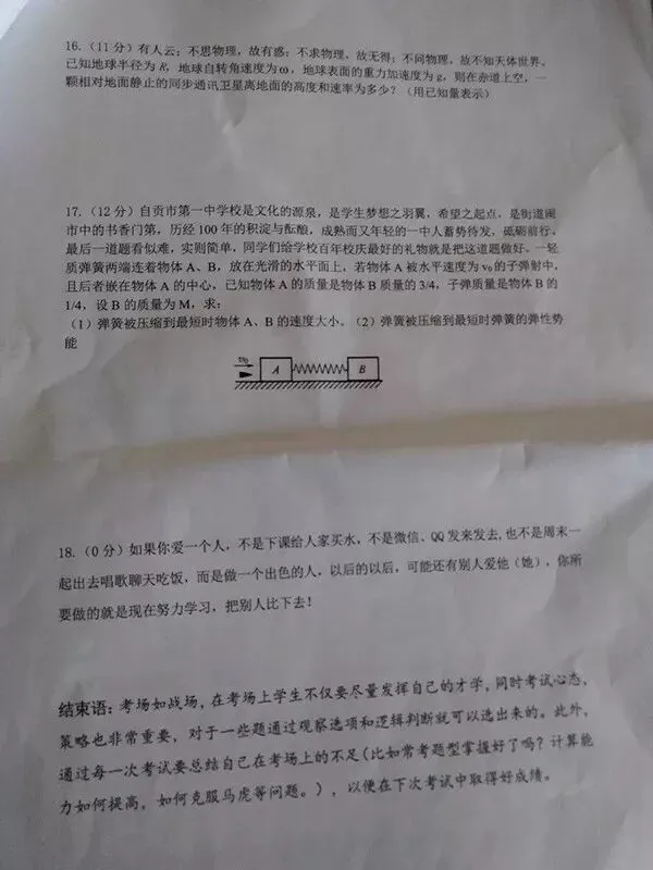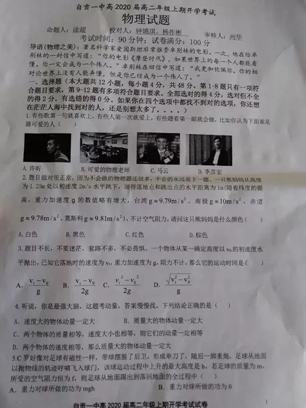 你能想象吗?这些“段子”来自今年秋季开学时的一张物理试卷。命题人涂超老师是自贡一中刚入职一年多的物理老师,今年28岁。他花了差不多整个假期来命题,并觉得“这是一件很开心的事!”