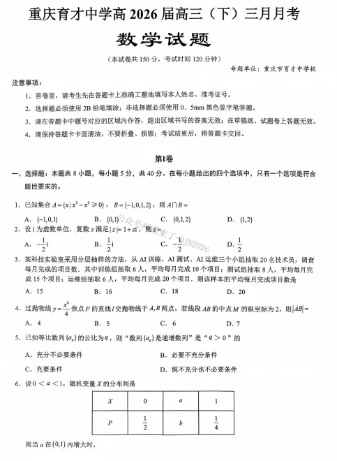 【试卷】重庆育才中学高2026届高三(下)3月月考(全科)