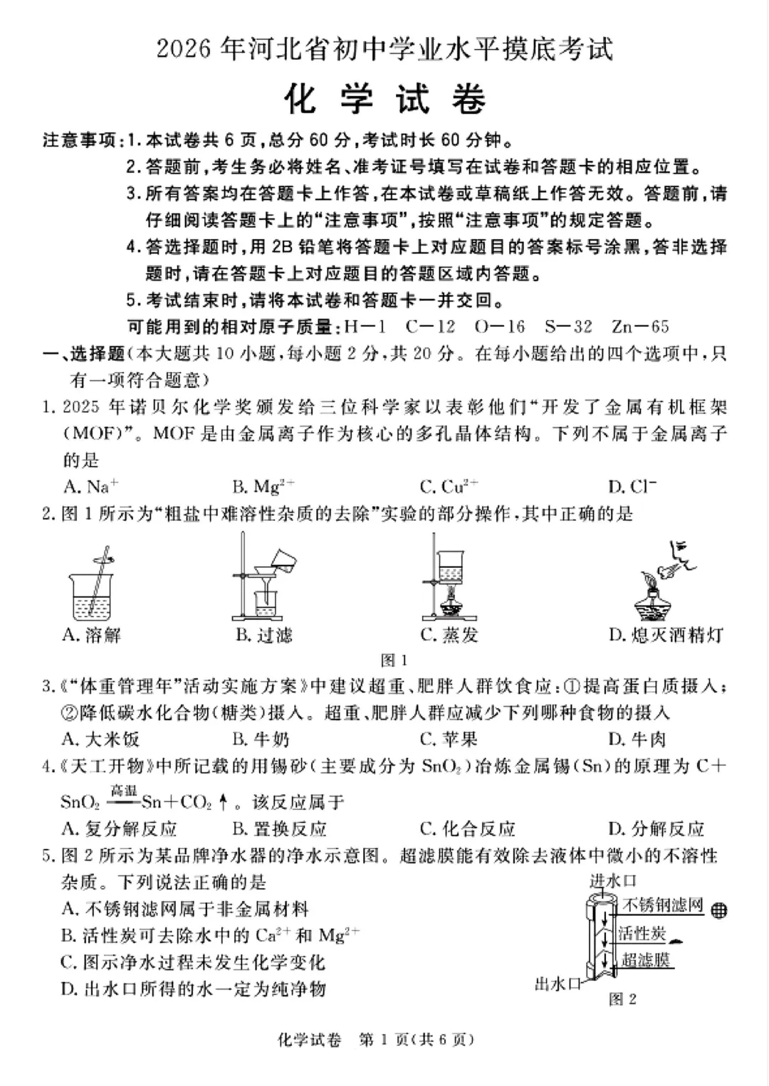 2026河北省中考化学摸底试卷
