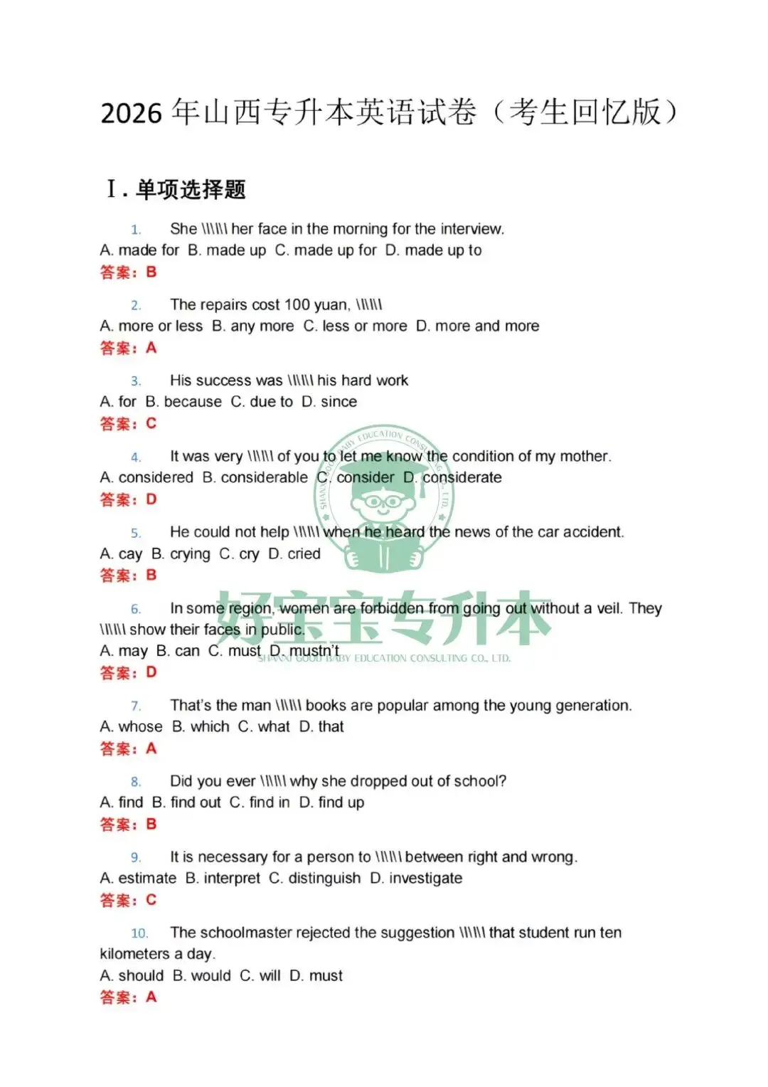 >英语|2026年山西统招专升本考试真题还原出炉!