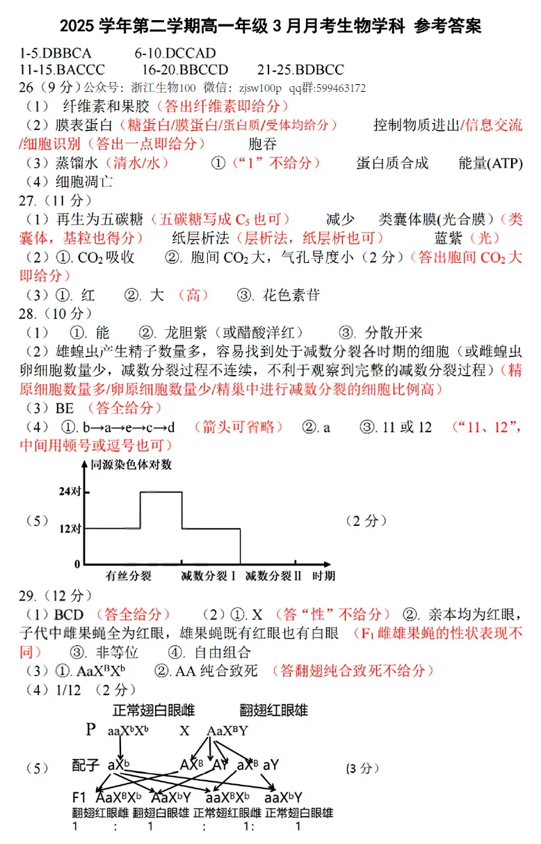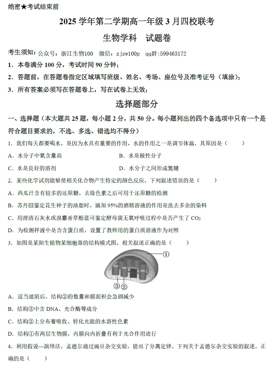 2025年3月浙南名校、名校协作G12、强基联盟高一高二生物试卷答案、解析汇总可下载!