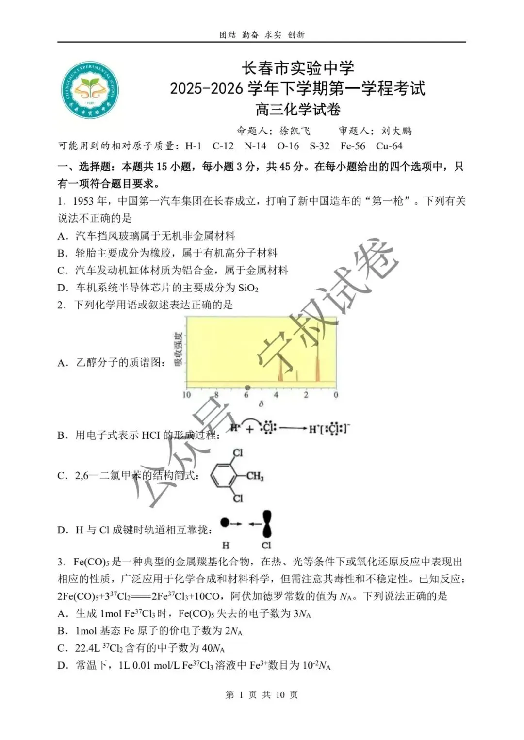 2026.3市实验九下第一学程考试化学试卷