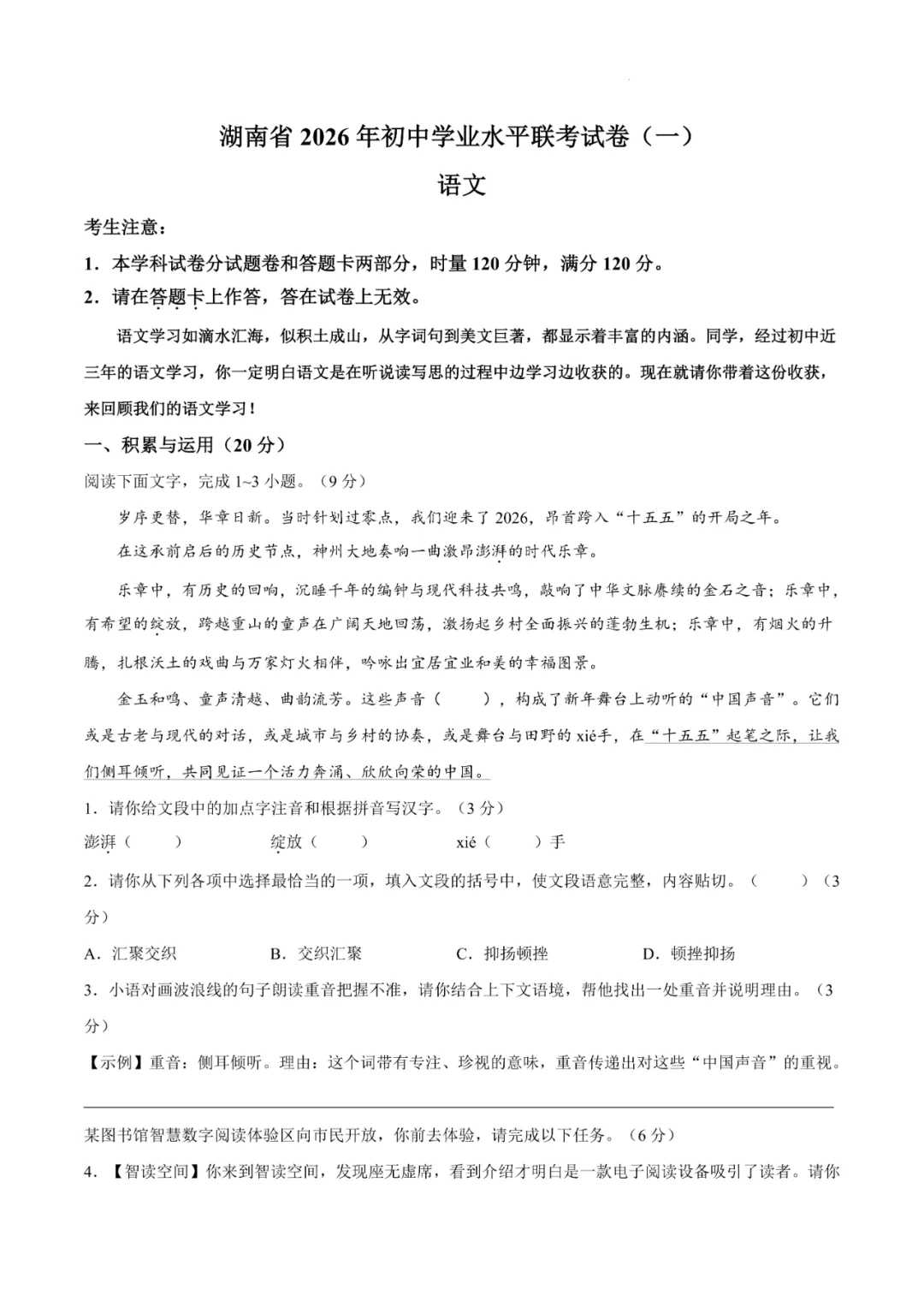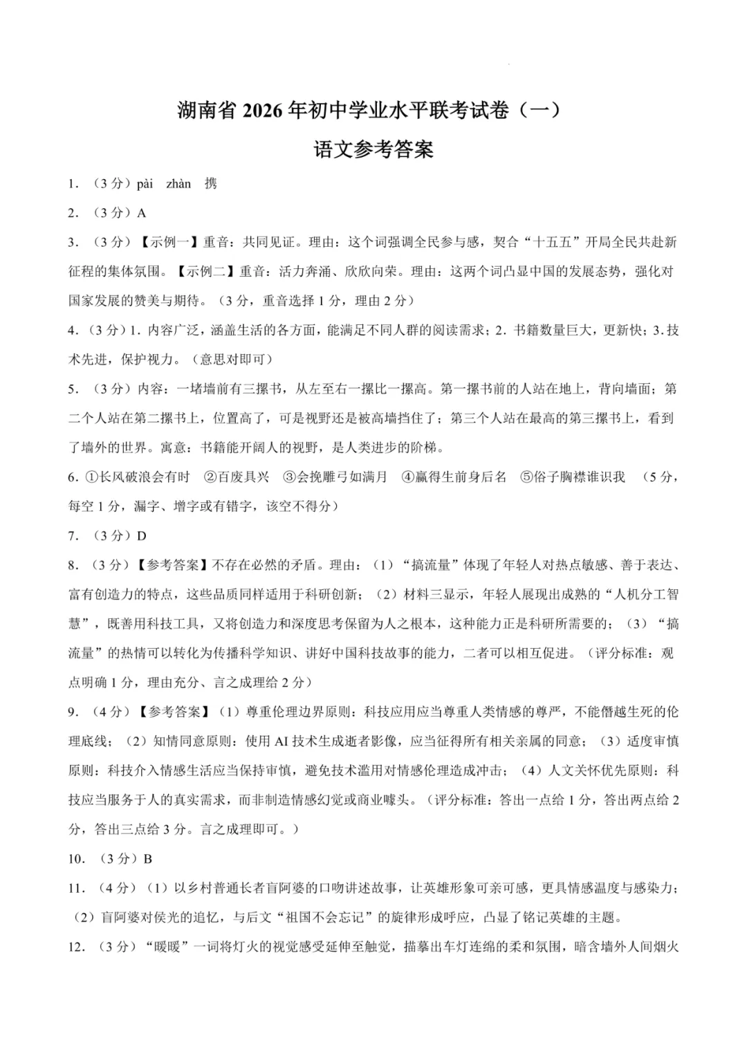 试卷紧扣九年级语文核心素养,围绕“开局”核心主题,全面考察了字音字形、朗读技巧、图文转换、非连续性文本(AI、流量与科研)的整合与辩证分析、小说(《墙内墙外》)的细节赏析与主旨升华、古诗(《独坐敬亭山》)的意象解读与情感体悟、文言文(《韩诗外传》与《吕氏春秋》选段)的综合理解与比较、名著插图与核心主题的深度联结(《艾青诗选》)及开放性写作。积累与运用(第1-5题)是主要得分点。难点在于综合性学习中对“读书”寓意的深度解读与图文转换、非连续性文本阅读中对矛盾现象的辩证评析与伦理原则提炼、小说阅读中对人物情感与象征意义的细腻分析、以及文言文阅读中人物形象的综合对比,这些题目对学生的信息整合、逻辑推理、批判性思维与文化理解能力提出了系统性、高阶性的全面考验。