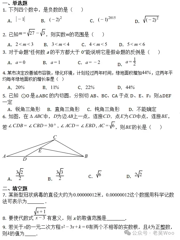2026南京市一中集团中考零模数学试卷+答案(2026.3)