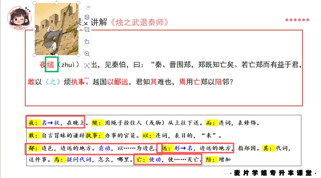 夜缒而出,见秦伯,曰:“秦、晋围郑,郑既知亡矣。若亡郑而有益于君,敢以烦执事。越国以鄙远,君知其难也,焉用亡郑以陪邻?邻之厚,君之薄也。若舍郑以为东道主,行李之往来,共其乏困,君亦无所害。且君尝为晋君赐矣,许君焦、瑕,朝济而夕设版焉,君之所知也。夫晋,何厌之有?既东封郑,又欲肆其西封,若不阙秦,将焉取之?阙秦以利晋,唯君图之。”