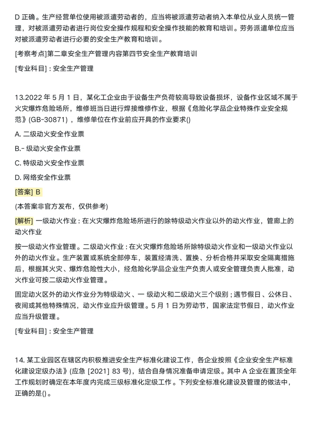 级动火作业:在火灾爆炸危险场所进行的除特级动火作业以外的动火作业,管廊上的动火作业按一级动火作业管理。
