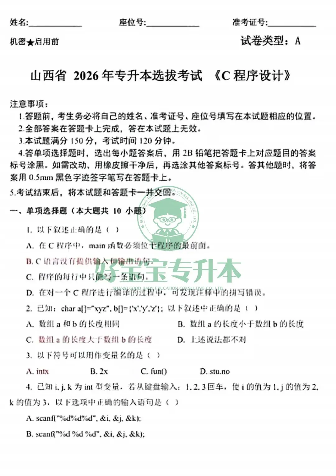 >c程序设计|2026年山西统招专升本考试真题还原出炉!