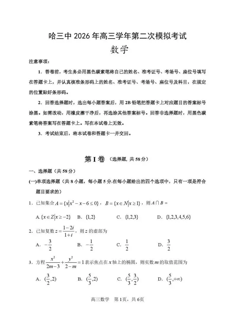 >【高一、高二、高三最新月考试卷】2026届哈三中高三二模数学+答案