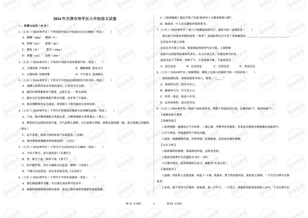 >2024年天津市河东区小升初语文试卷
