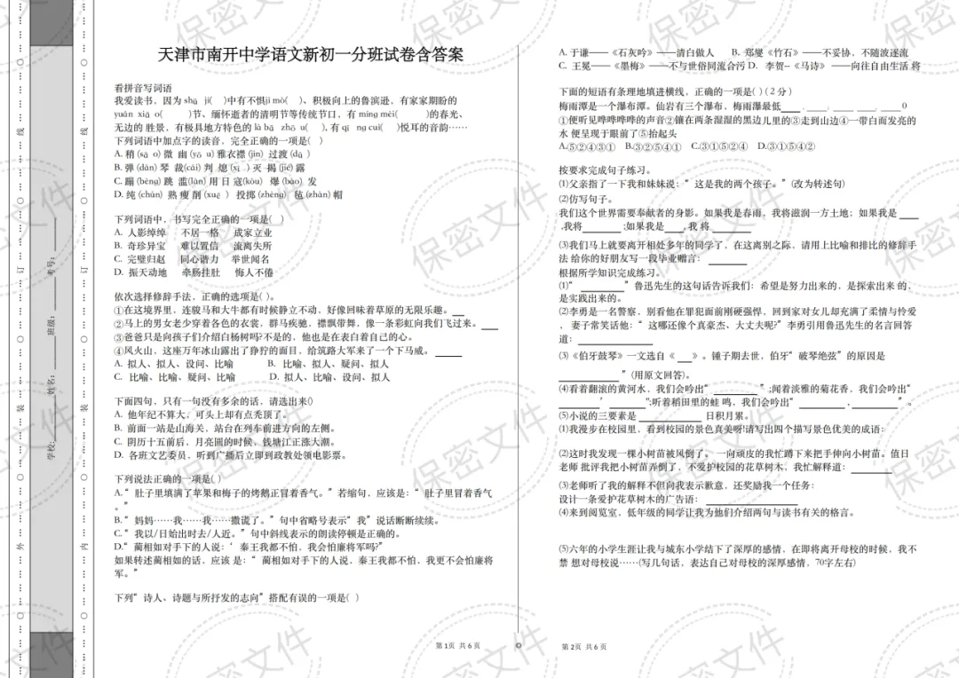 >天津市南开中学语文新初一分班试卷