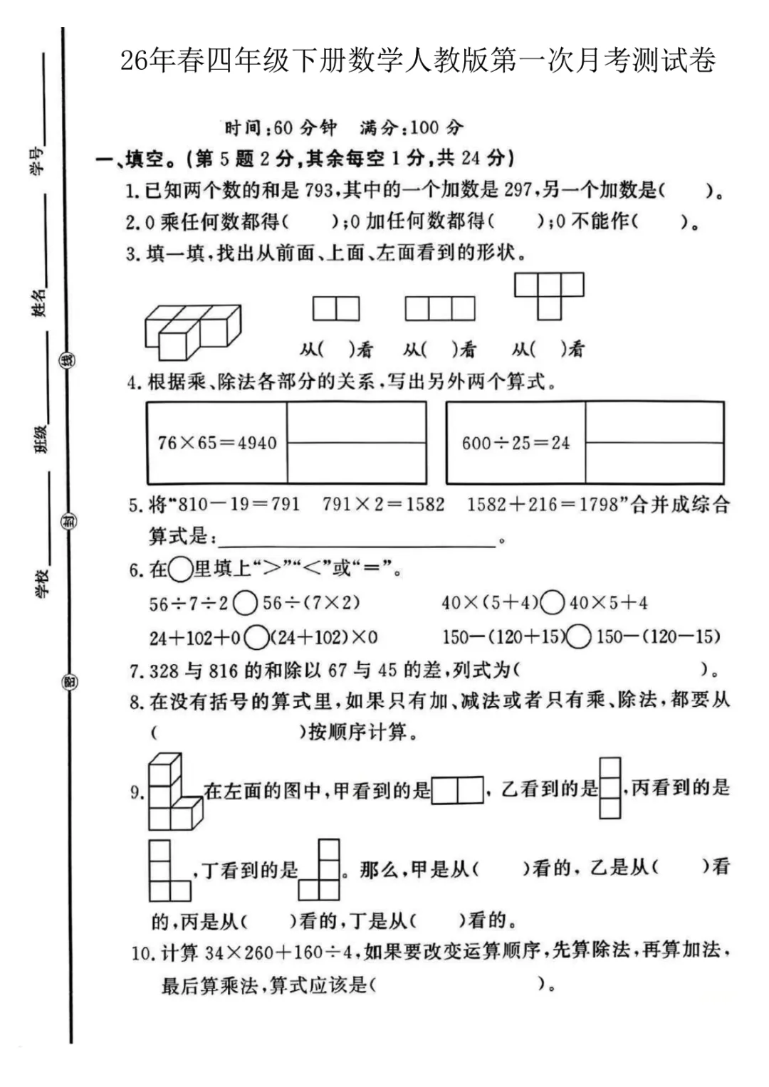 小学语/数/英《第一次月考试卷》1-6年级下册(PDF电子版,可下载打印)