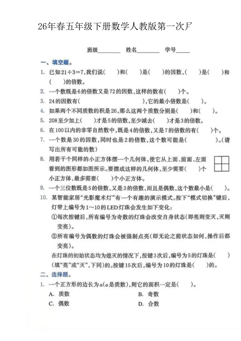 >2026春数学五年级下册第一次月考试卷,含答案