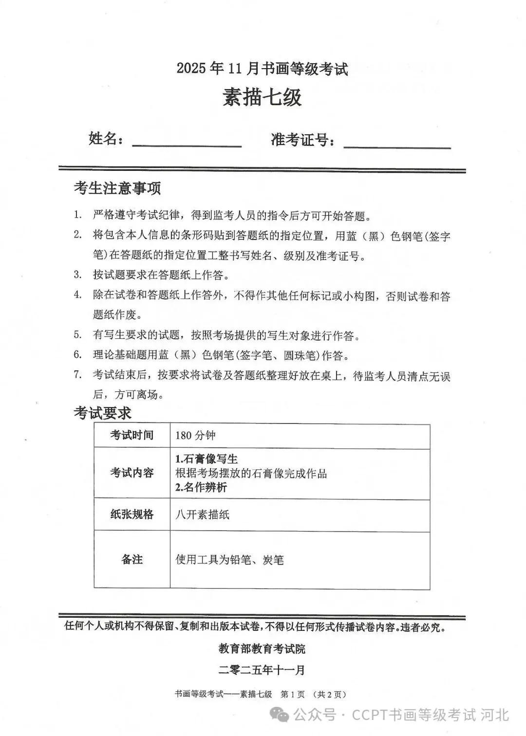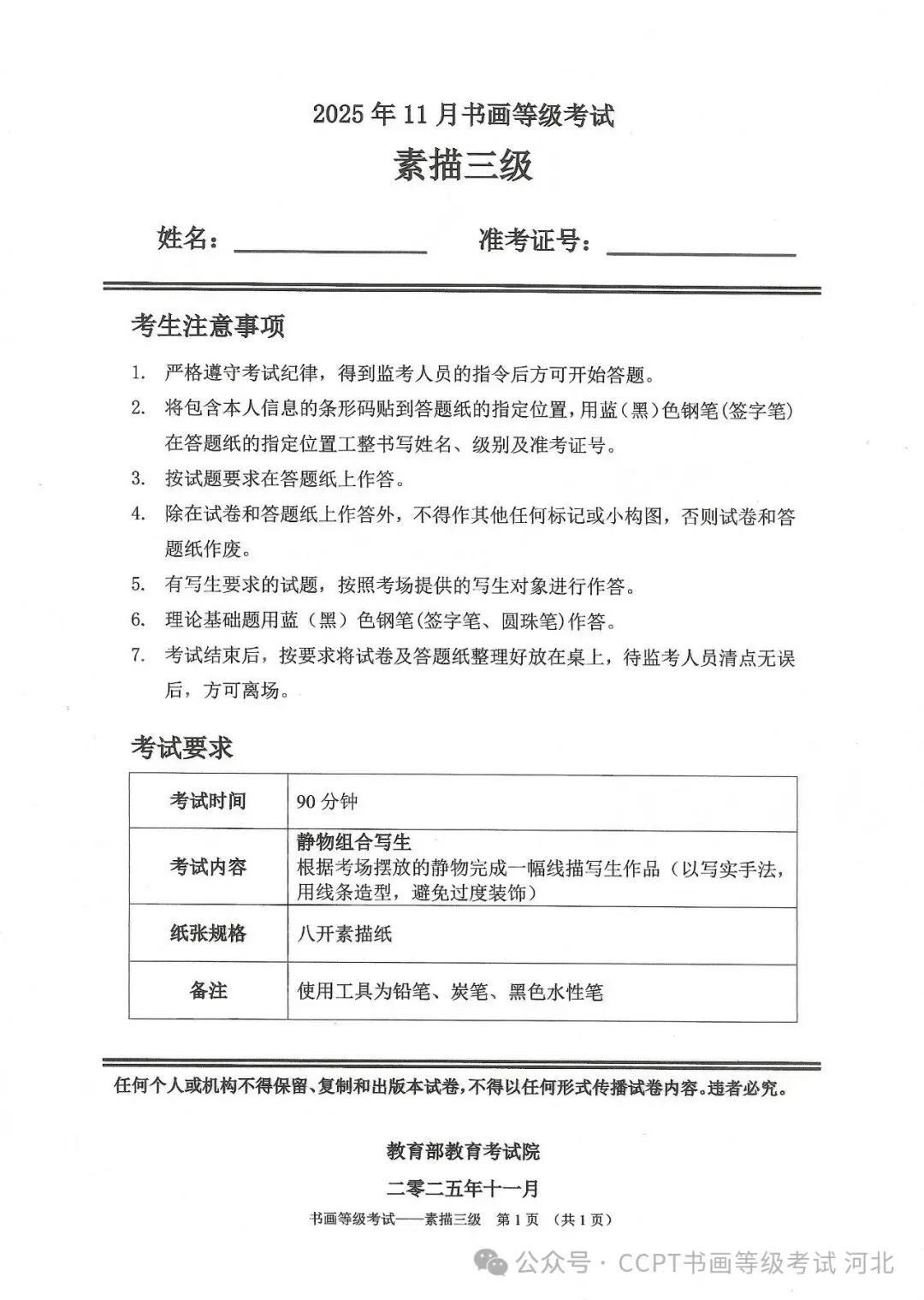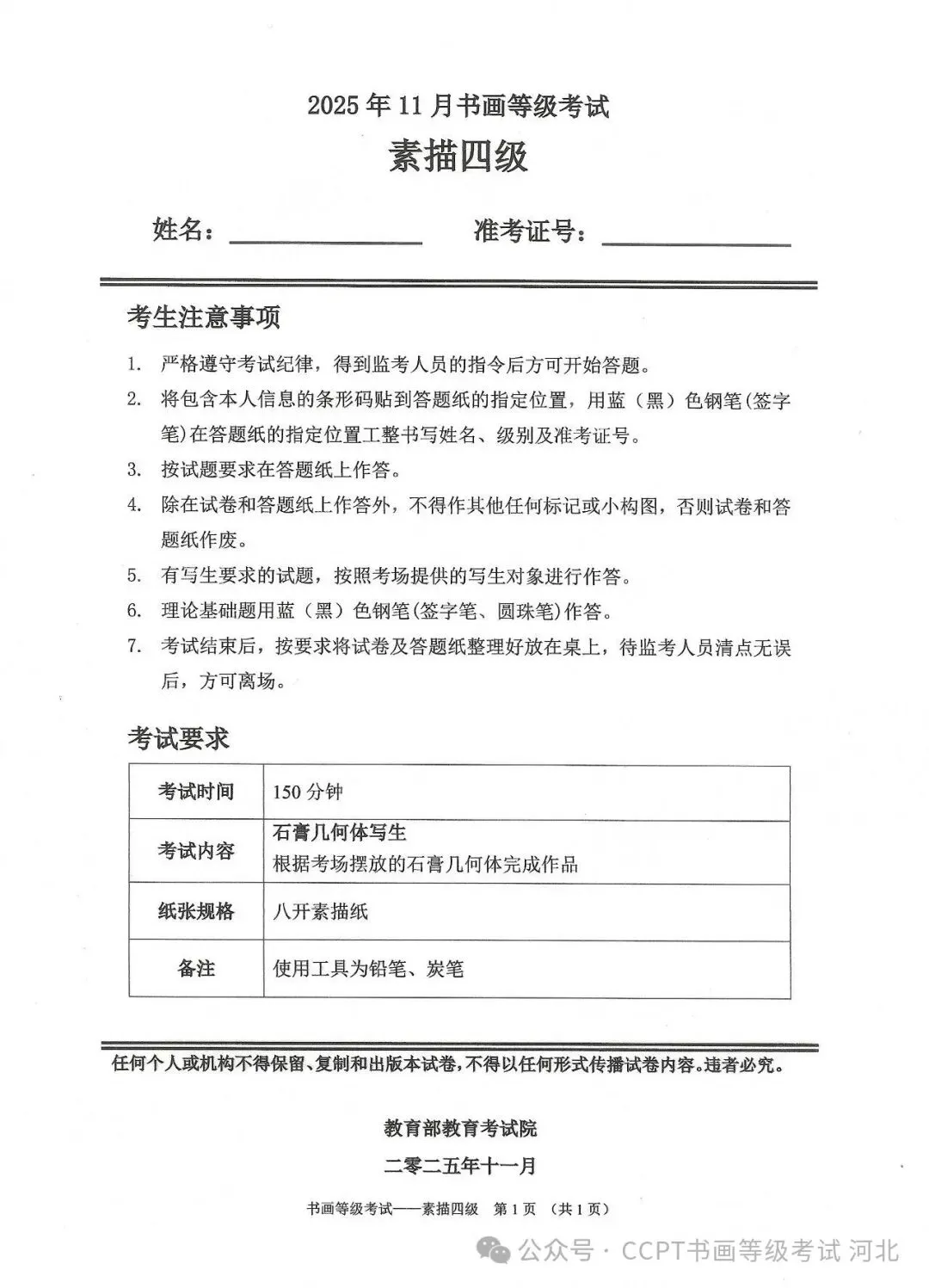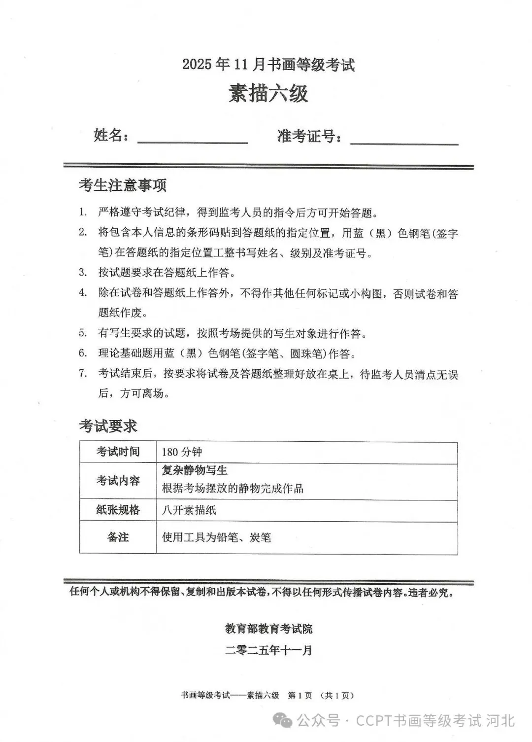 >2025年11月份教育部书画等级考试真题--素描科目