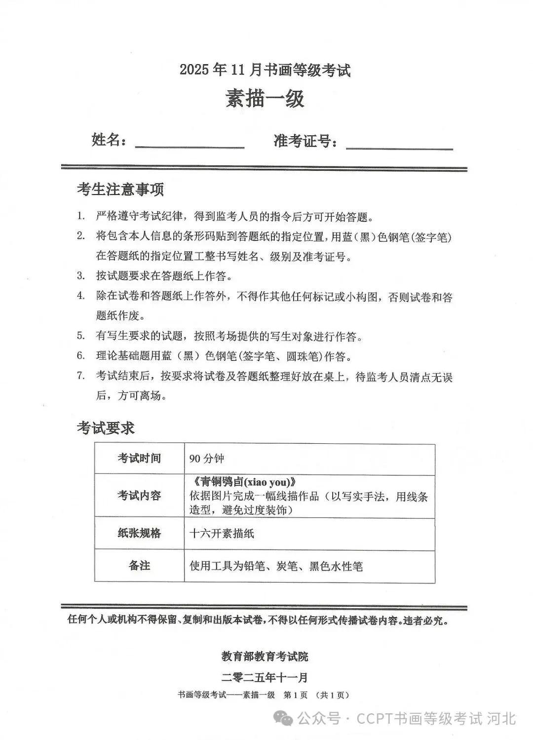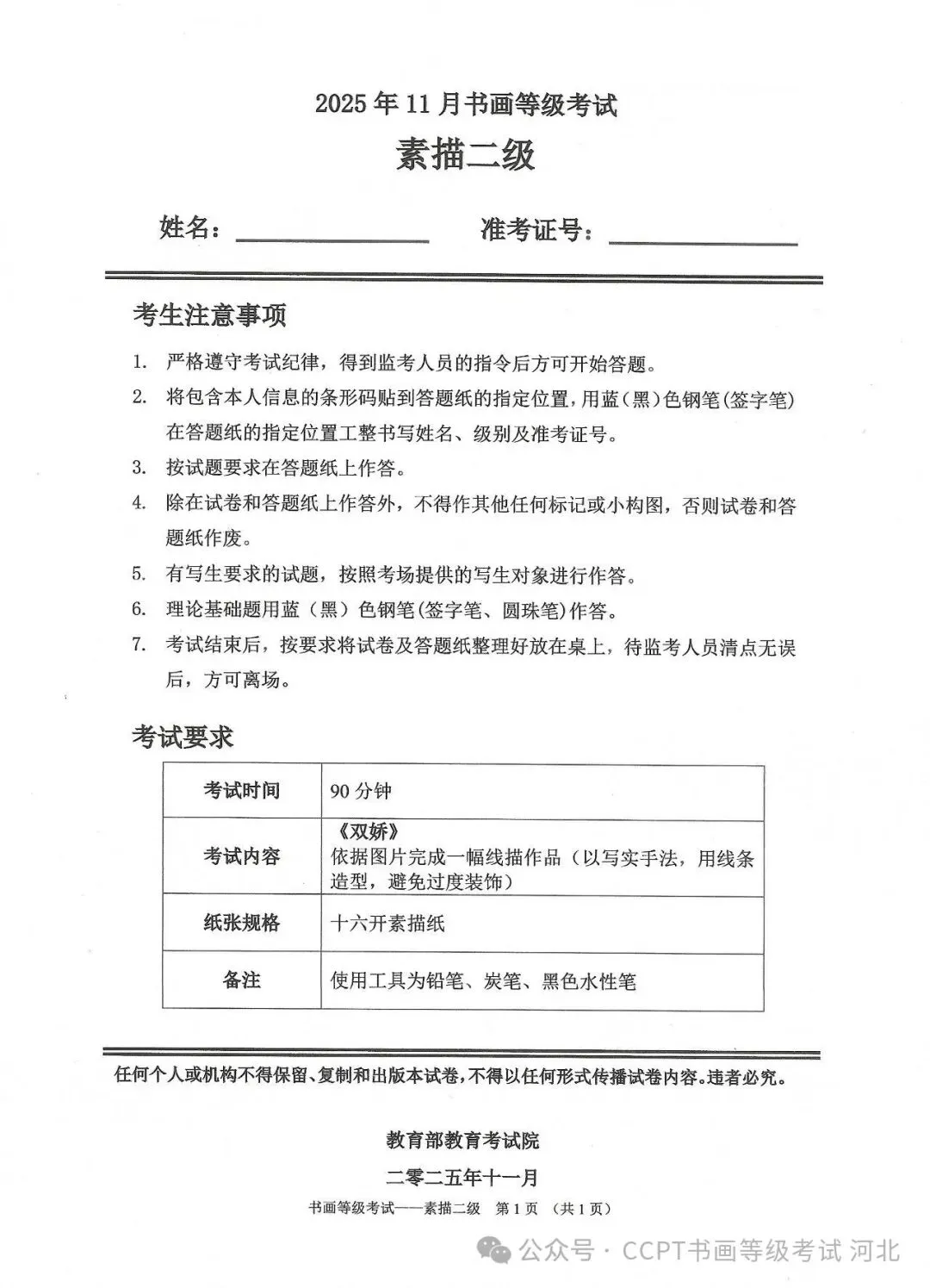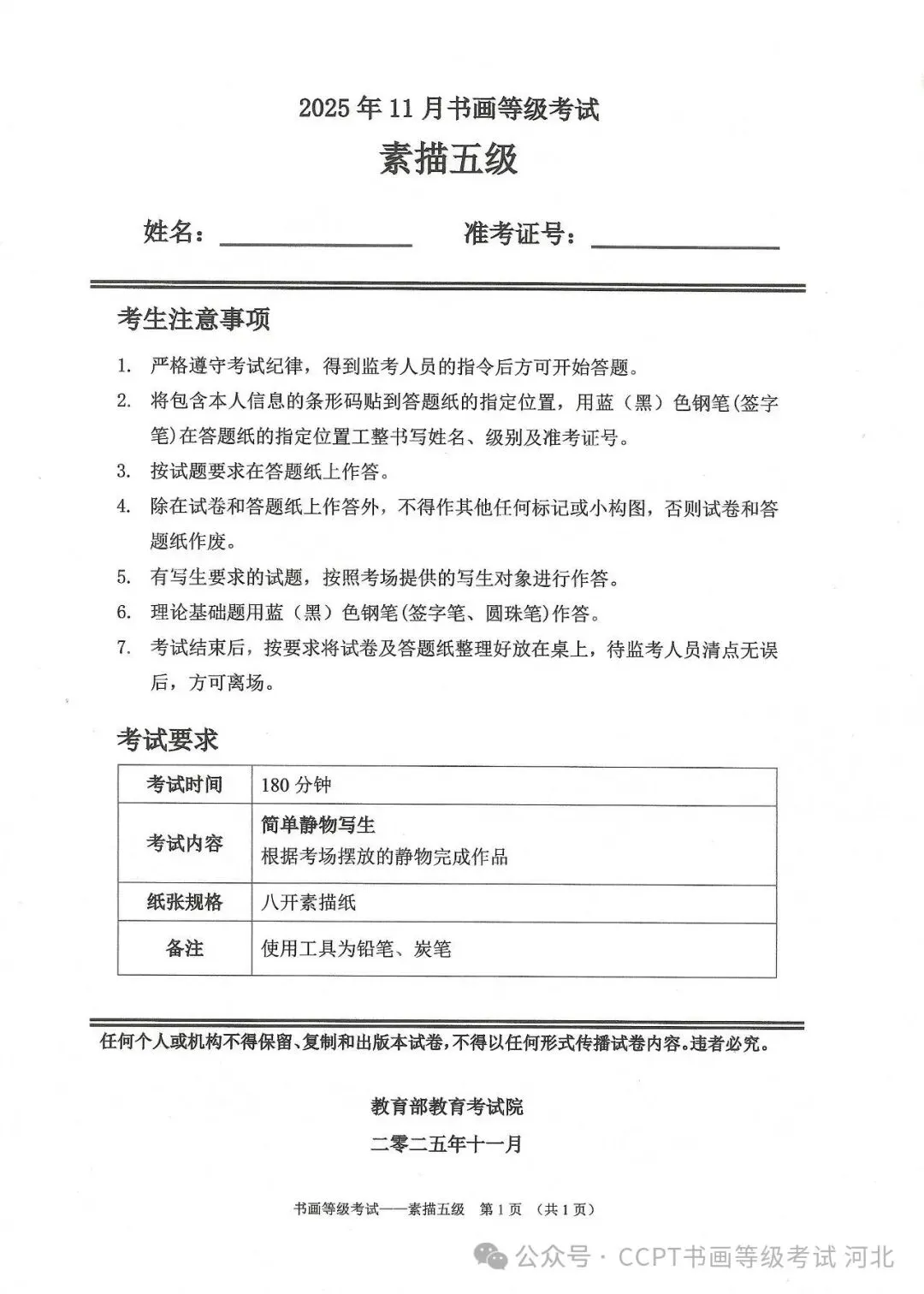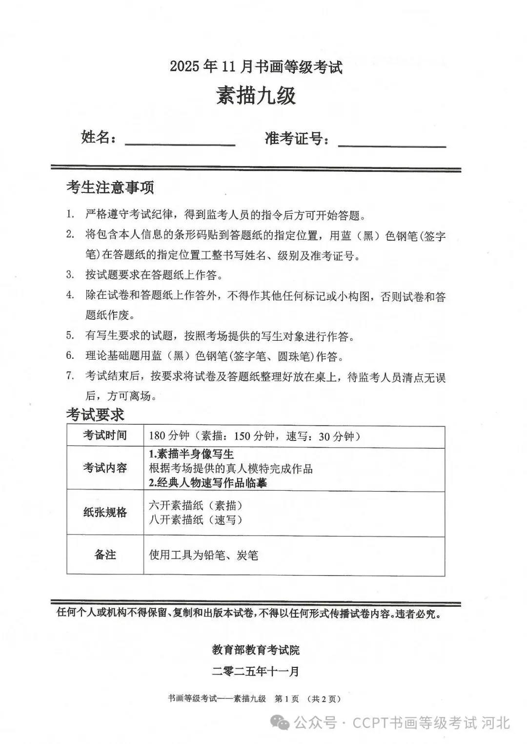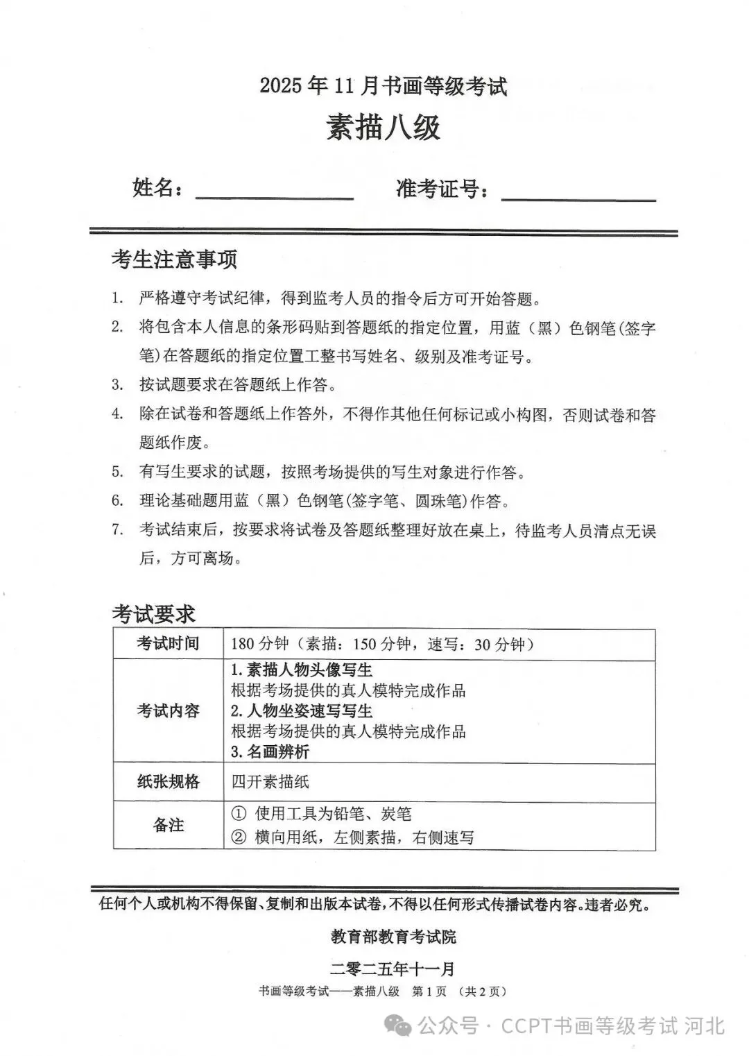 >2025年11月份教育部书画等级考试真题--素描科目