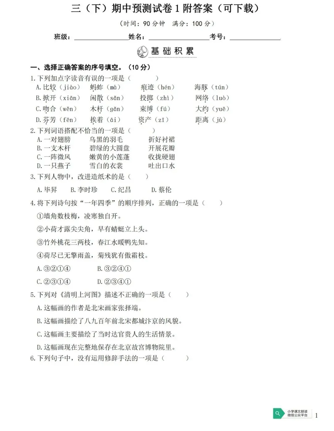 >三(下)期中预测试卷1附答案(可下载)