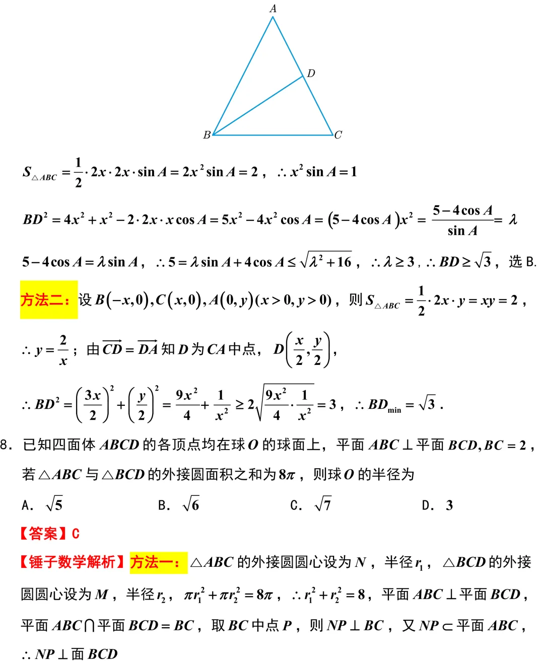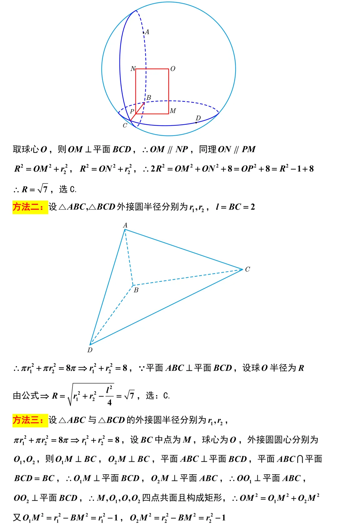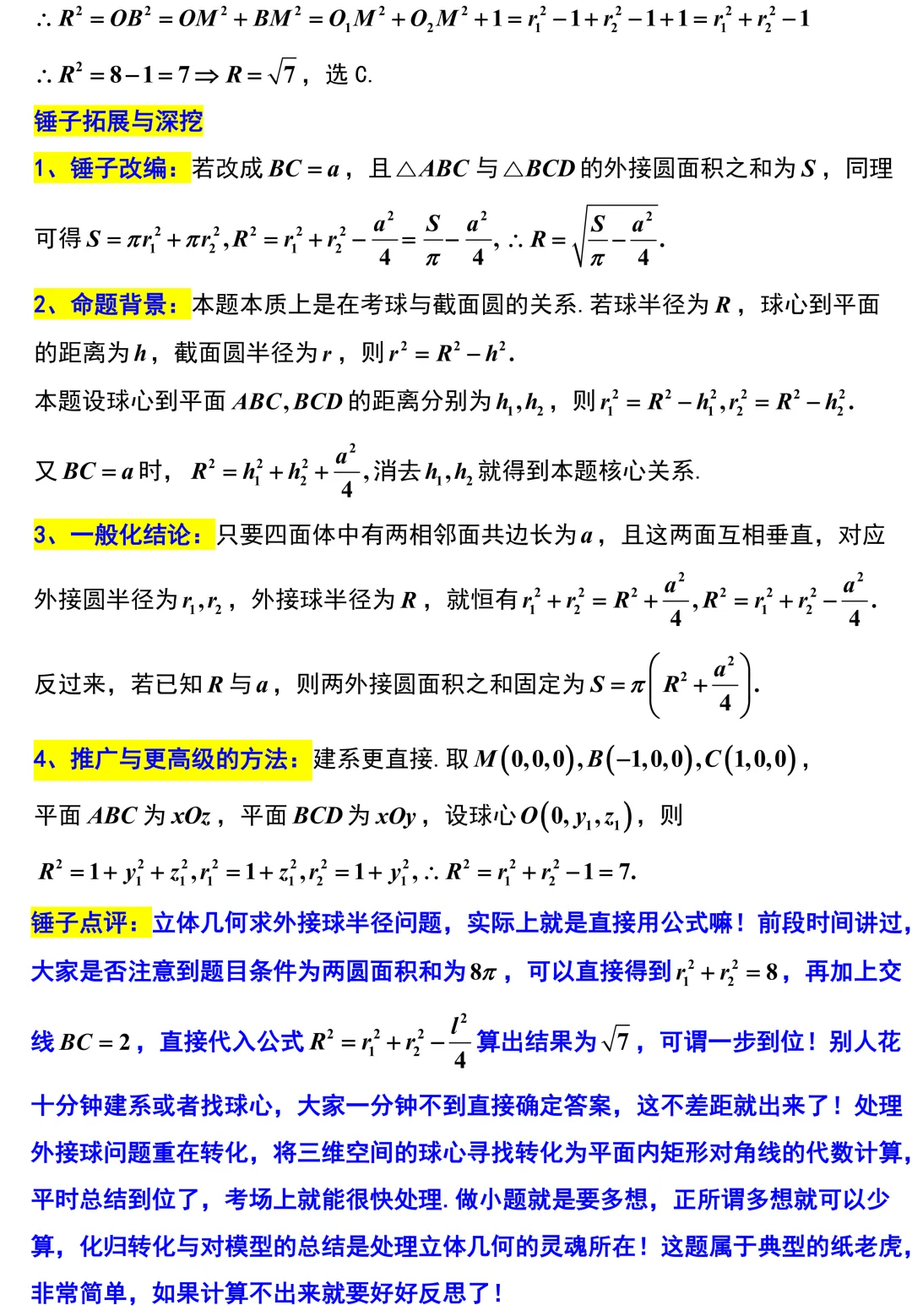 第8题,外接球问题,如果花大量时间去建立空间直角坐标系或者苦苦寻找球心,考场上的时间肯定捉襟见肘.但如果同学们平时总结到位,看出这是典型的两相邻面互相垂直且共底边的几何结构,直接代入公式,一分钟不到就能确定答案.别人在痛苦地画图,同学们已经拿分走人,这差距不就显现出来了.