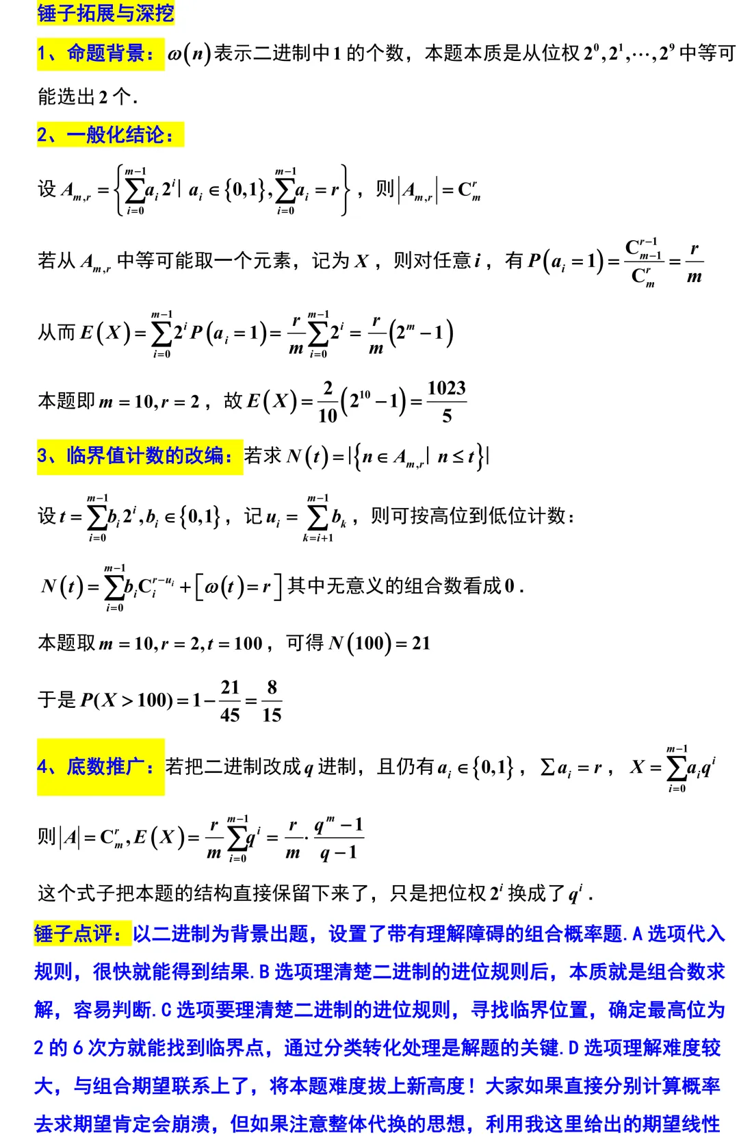 第11题,以二进制作为背景,巧妙地把组合数、概率与期望融合在了一起.如果同学们理不清进位规则的本质,或者试图按部就班地分别计算概率再去求期望,那庞大的计算量绝对会让同学们崩溃.但我这里在拓展部分给大家点出了期望的线性性质,掌握了这个整体代换的核心思想,复杂的式子很快就能化简出结果.这种将代数结构与概率模型深度结合的考法,不仅新颖,而且区分度很强.