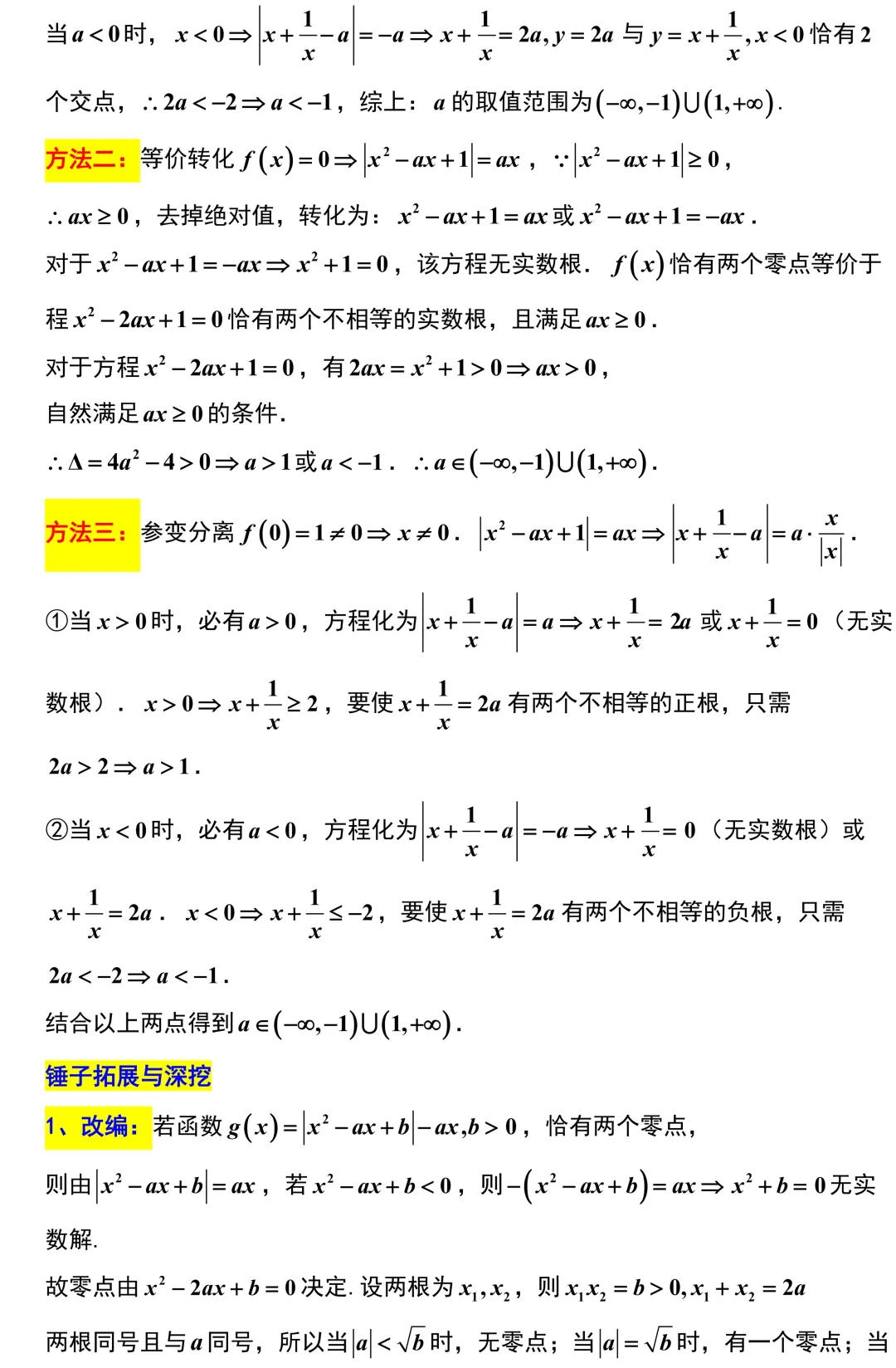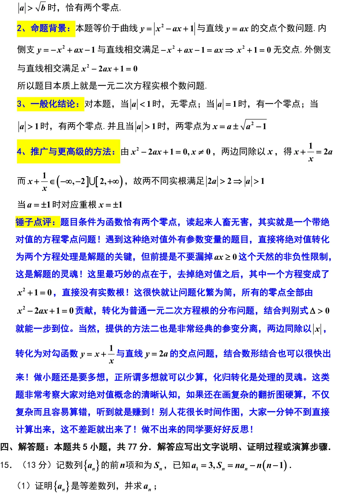 第14题,题目说函数恰有两个零点,读起来人畜无害,其实内核是一个带有绝对值的方程零点问题.遇到这种绝对值外还有参数变量的题目,脱掉绝对值转化为两个方程去处理是解题的灵魂.同学们只要理清非负性限制,去掉绝对值后就会发现其中一个方程根本没有实数根,问题自然就转化为了一元二次方程根的分布,结合判别式一步就能得出答案.