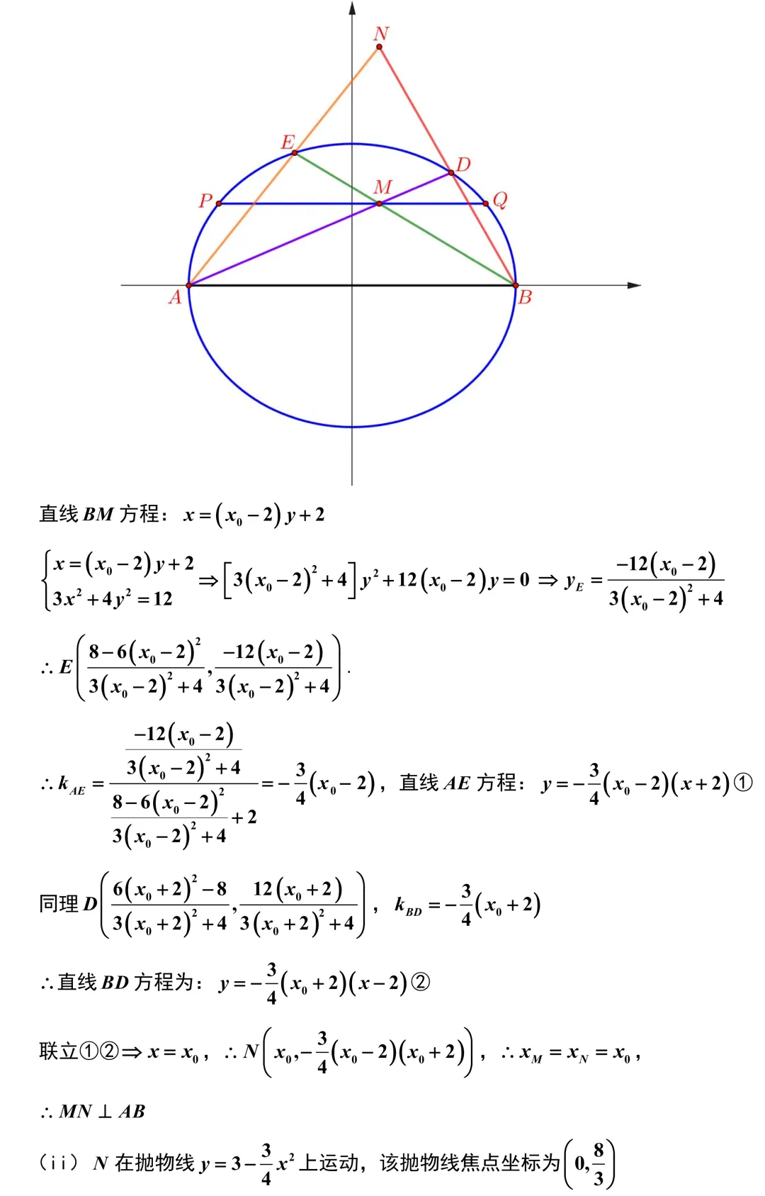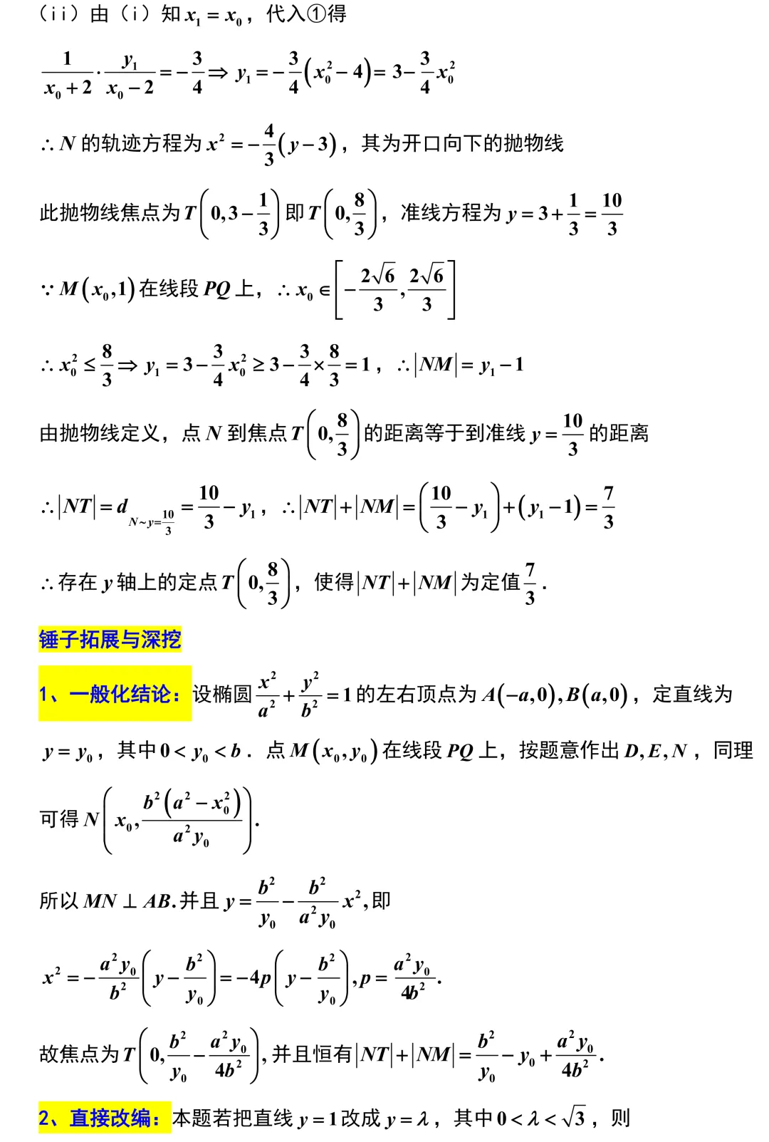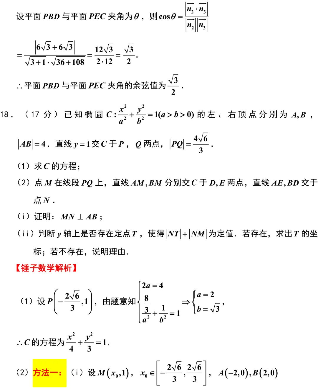 第18题,前半部分利用椭圆端点弦斜率乘积为定值的核心结论,避免了繁琐的韦达定理联立,很快就能理清交点关系.最绝的是它的第二小问,同学们在代数变形后会惊喜地发现,动点的轨迹竟然变成了一条开口向下的抛物线.此时题目要求两线段长度和为定值,刚好可以完美转化为抛物线的定义,利用点到准线的距离来降维打击.这种从椭圆平滑过渡到抛物线的题目设计,逻辑环环相扣,非常考验大家对圆锥曲线本质的认知.