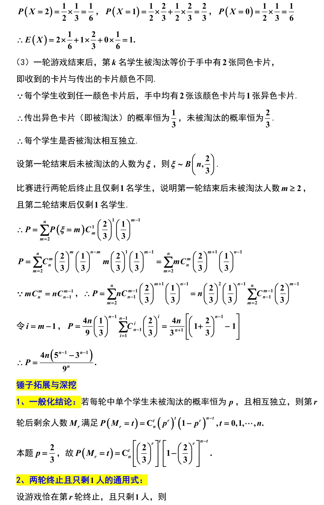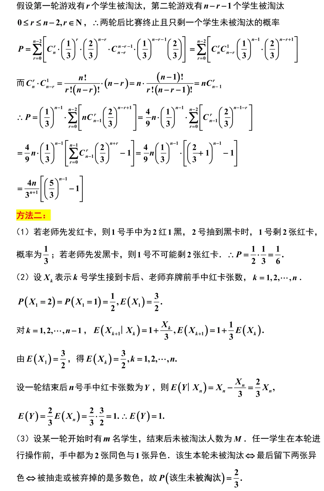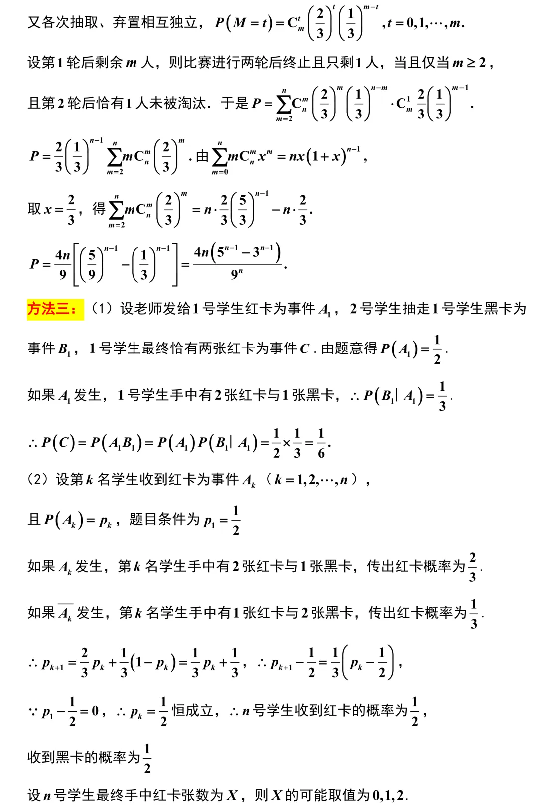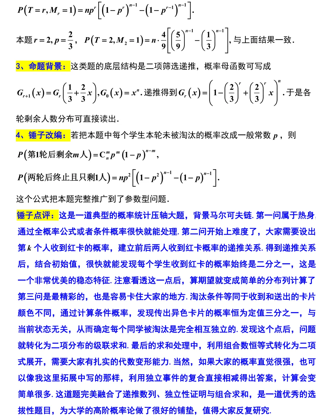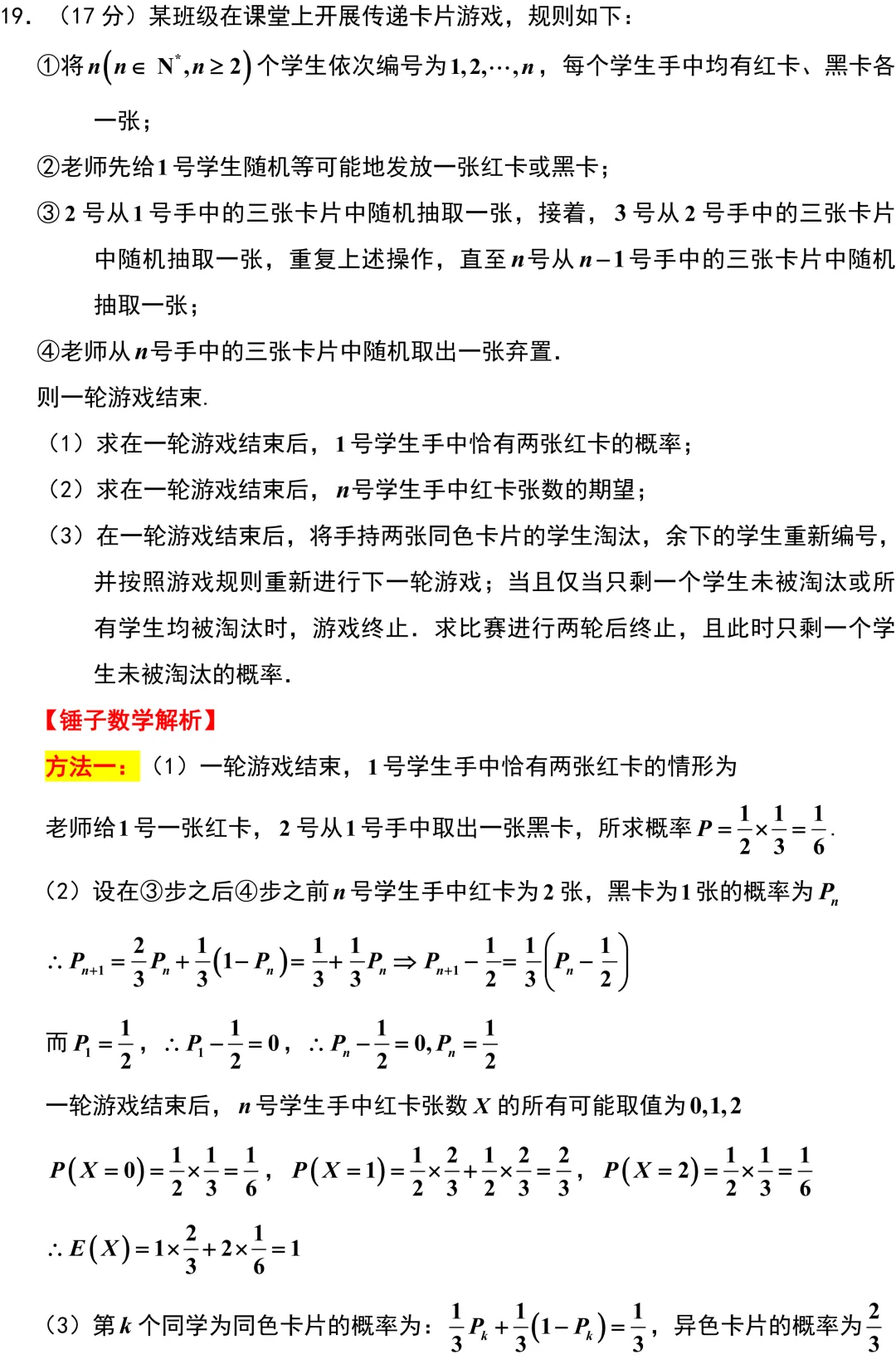 第19题,一道背景极其深厚的概率大题,它的底层逻辑其实是大学里的马尔可夫链.从第二问建立递推关系开始,同学们就会发现每个学生收到红卡的概率始终保持二分之一这个优美的稳态特征.到了第三问,通过条件概率的分析可以确定,每个同学被淘汰这个事件是完全相互独立的,最终问题巧妙地转化为二项分布的级联求和与组合数恒等式的处理.这道题为大学的高阶概率论做了极好的铺垫,是一道不可多得的选拔性好题.