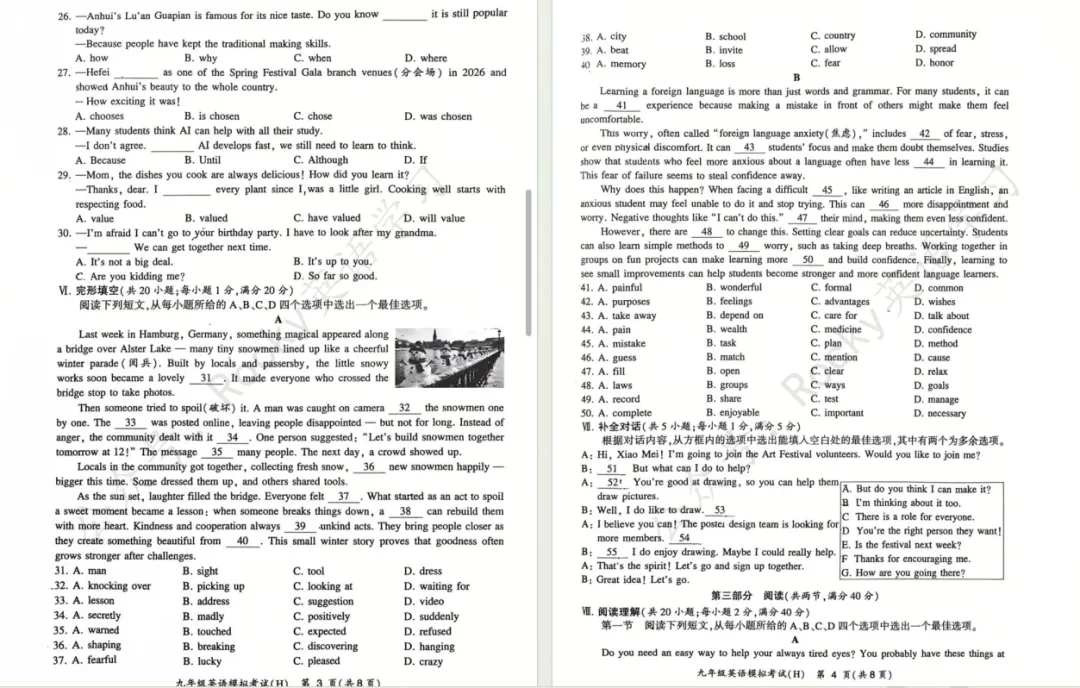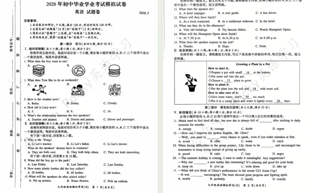 今日分享2026春中考一模卷:瑶海区的试卷,听力和答案