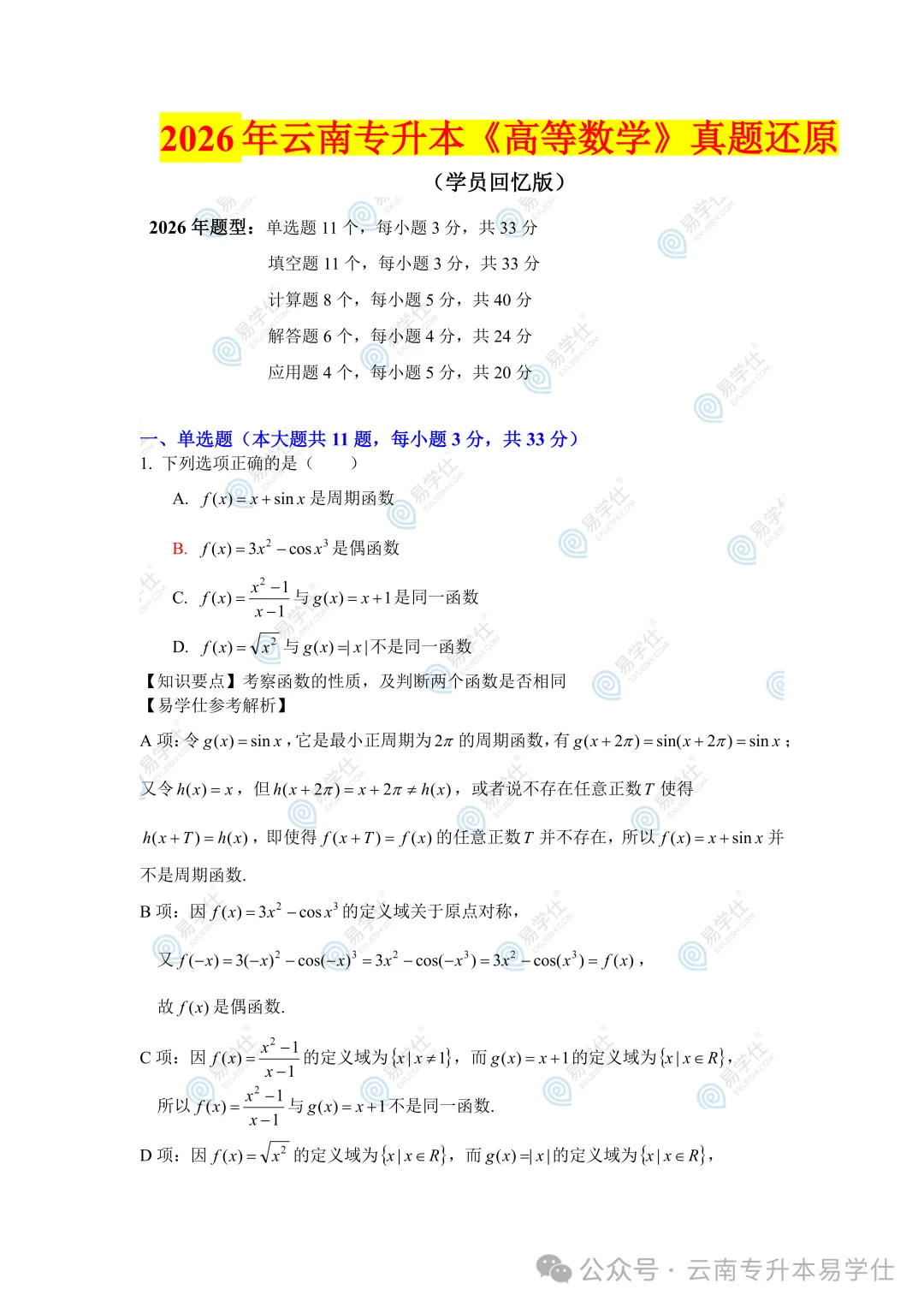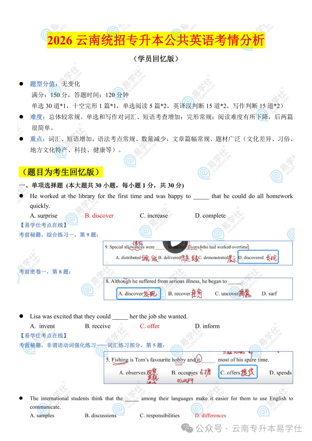 考完后根据同学们的回忆和反馈,整理了2026年云南专升本部分科目考试真题还原(回忆版)。