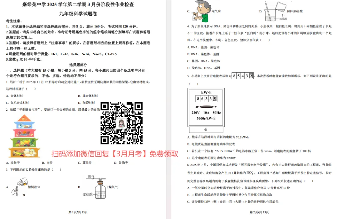 嘉绿苑中学2025学年第二学期3月份阶段性作业检查 九年级科学试题卷(含答案)