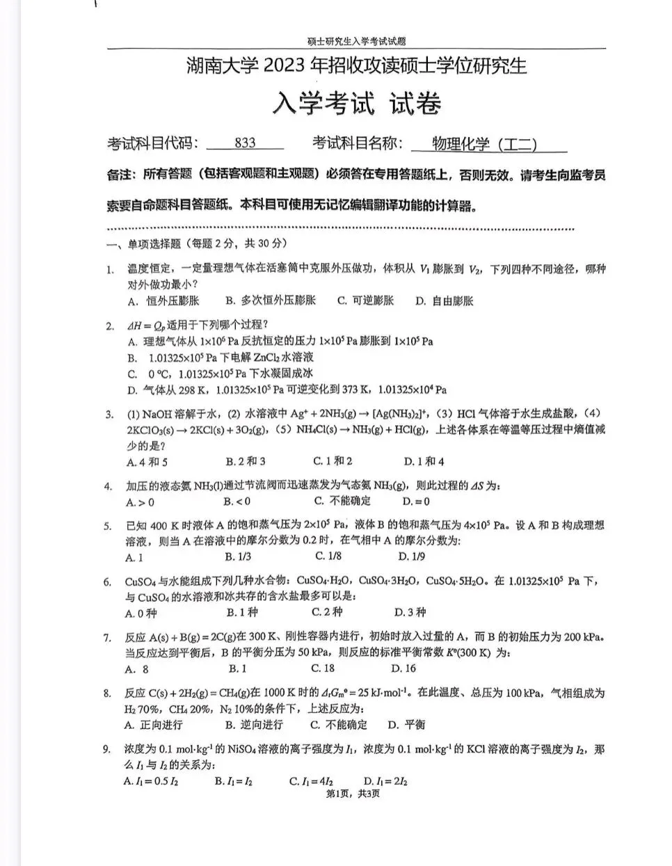 >湖南大学23物理化学考研真题