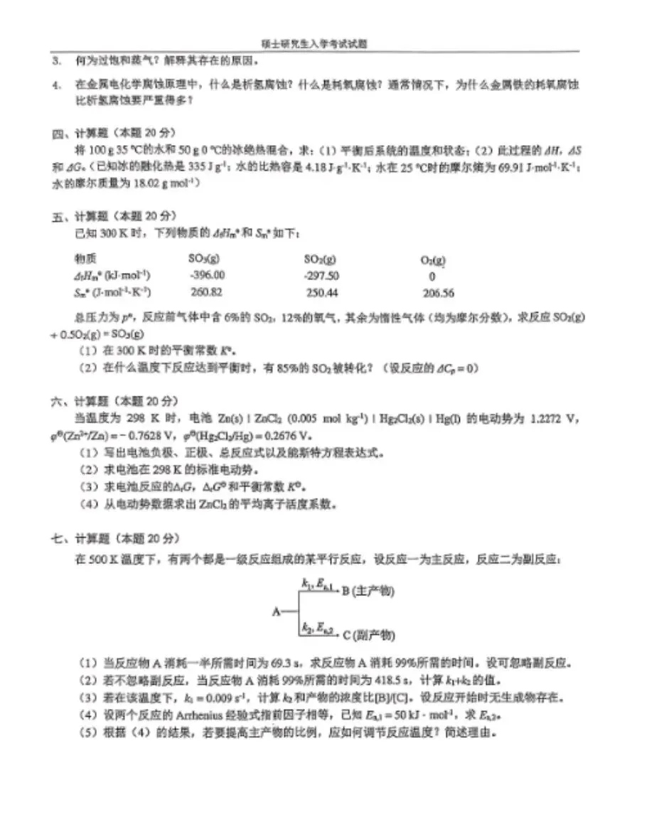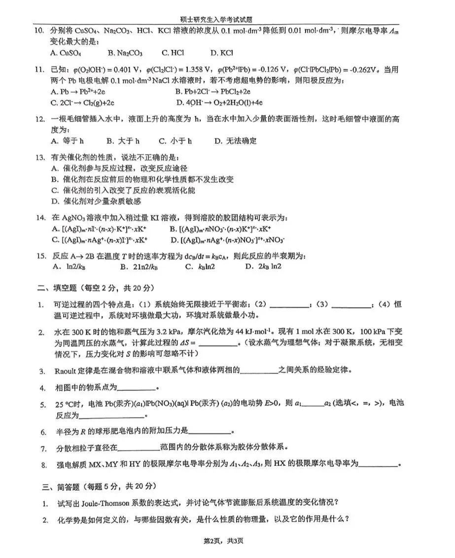 湖南大学23物理化学考研真题