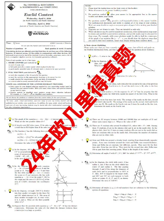 欧几里得数学竞赛是由加拿大滑铁卢大学数学与计算机学院主办的高中生数学竞赛,具有很高的含金量和广泛的影响力,2026年欧几里得竞赛4月1日考试,橘子老师将在静默期结束后第一时间给同学们发送真题,可以先添加小助手的微信,欧几里得考试赛制是怎么设置的呢?