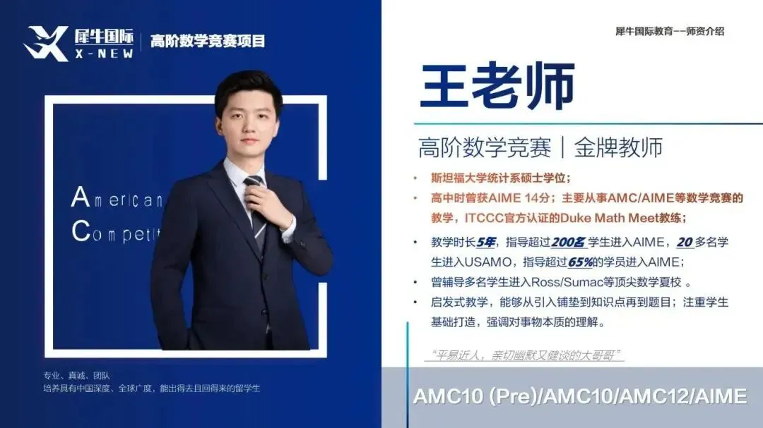 战绩:单师累计200+学生晋级AIME,35+学生获 AMC10前1%,65%+学员晋级AIME