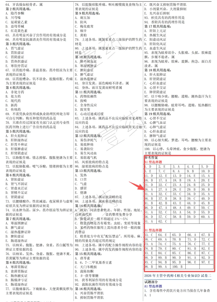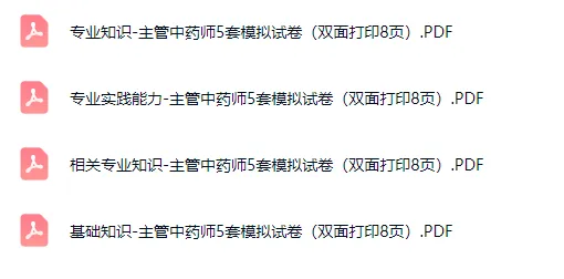 上周给大家更新了药士、药师、主管药师、中药士、中药师、主管中药师的模拟试卷。因为是图片版的,好像很多人看不到,今天给主管中药师模拟试卷汇总在一起给大家下载,也方便有错题更新还在同一链接下更新,上周有下载过的可以不用再下载。试题用的小五字体、三栏排版,正确答案在每张试卷的后面,方便不喜欢手机刷题的同学。试题来源网络,整理好免费分享,仅供大家学习使用!试题预览:关于错题:如果某一张连续出现两个以上的错题,可能是我排版时出错,如果是偶尔有一道,那就是原题有问题,买的正版纸质试卷估计也会出现。我目前没有时间核对,如果你在做题的时候发现,欢迎写留言指出哪道题出错。到时一起修订,出个更完美的版本。关于试题会不会在考试中出现:不好说有没有原题,但题型和考点肯定会很像,多练肯定有用,别只赌原题哦。以掌握知识点为主,不押题、不保证原题。打印版资料还是用的小五字号资料,打印出来不影响阅读基础知识、专业知识、相关专业知识、实践能力四科的文件预览:第1步:点击下方【壹药】