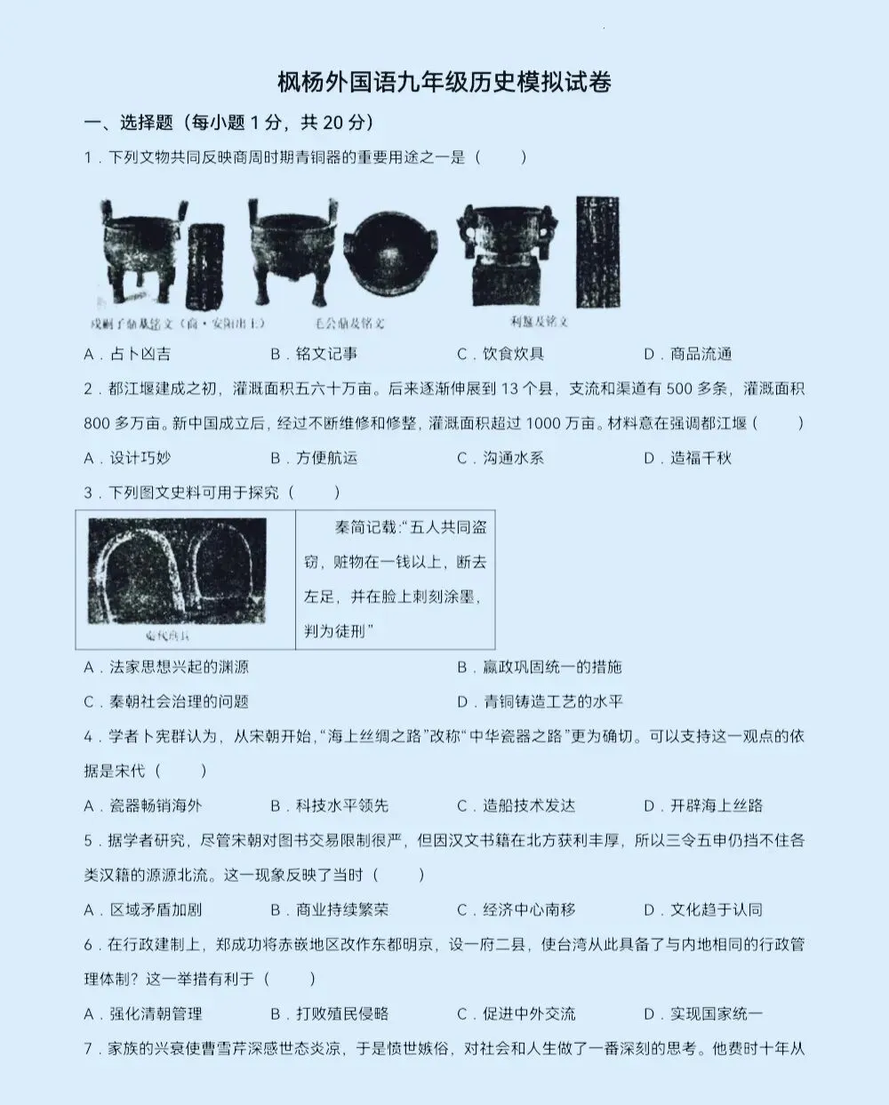 >郑枫杨外国语3月份模考历史试卷及答案