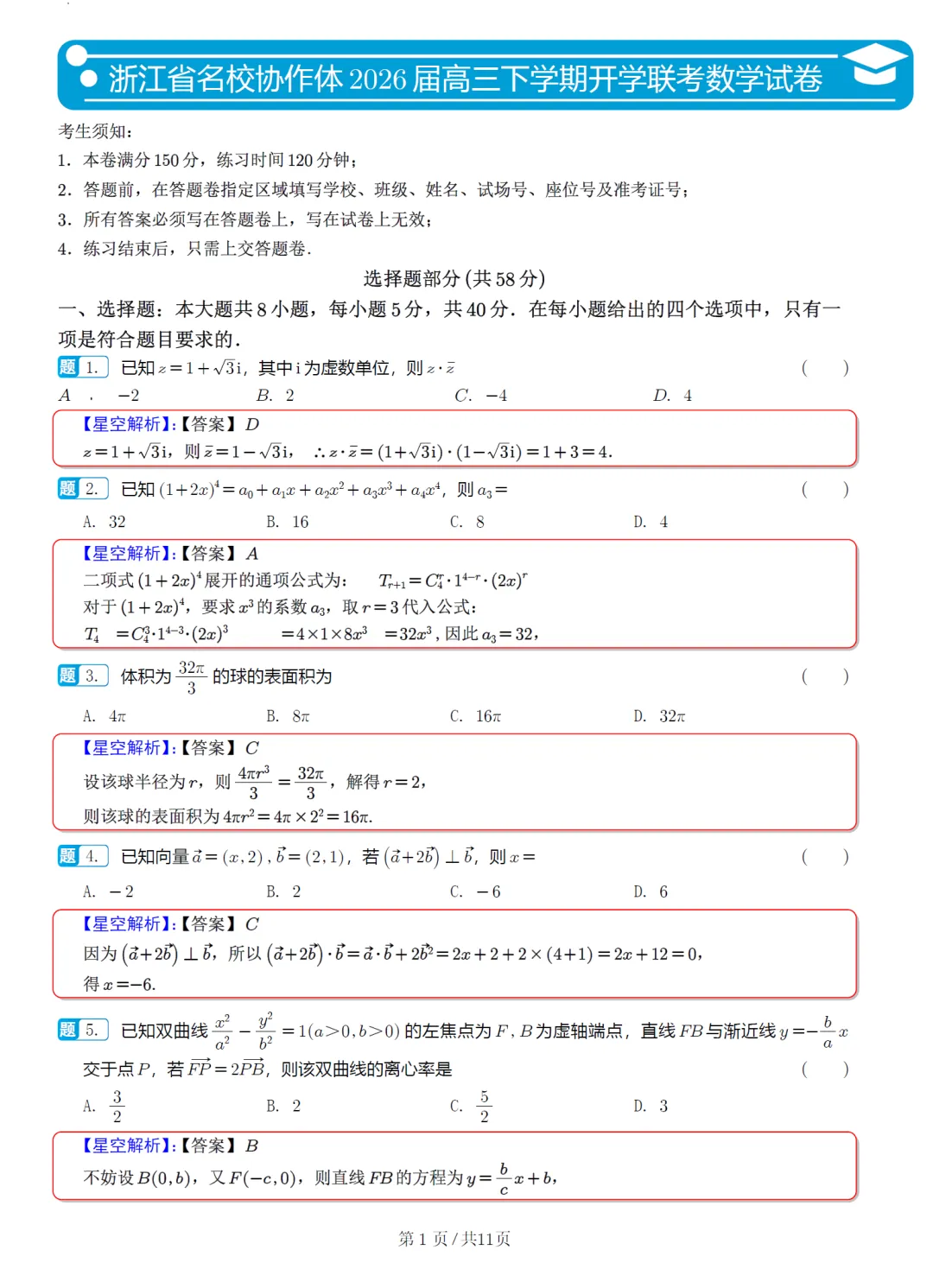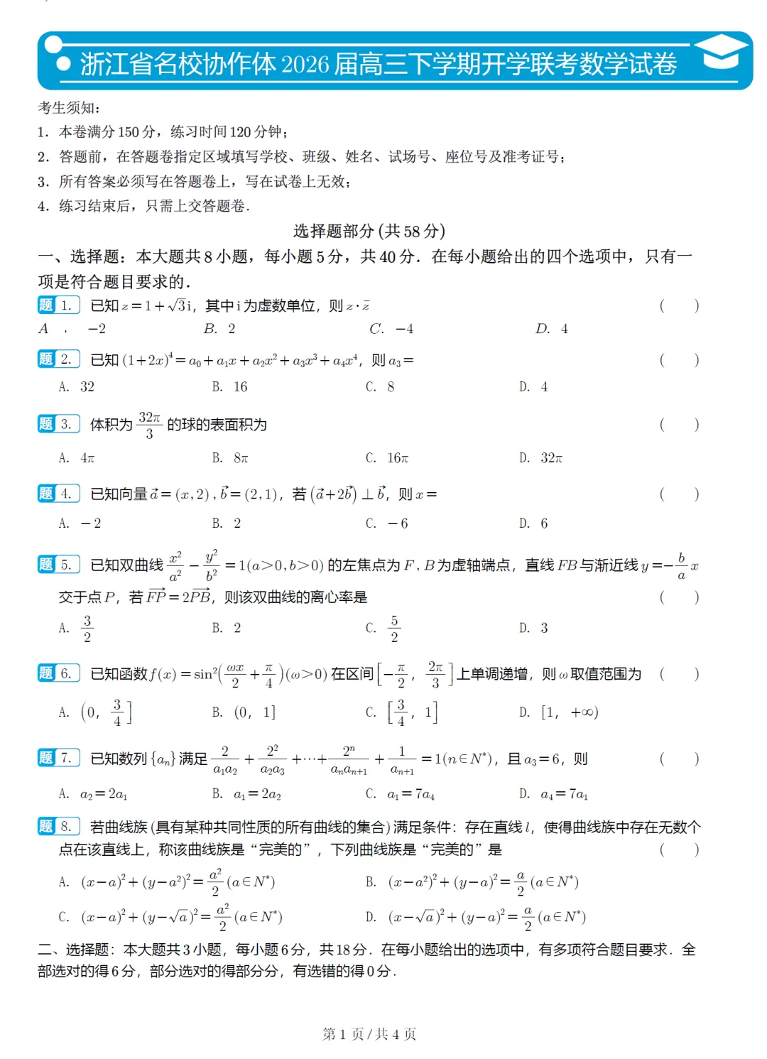 208.浙江z20名校联盟高三联考数学试卷及逐题解析(2026.2)