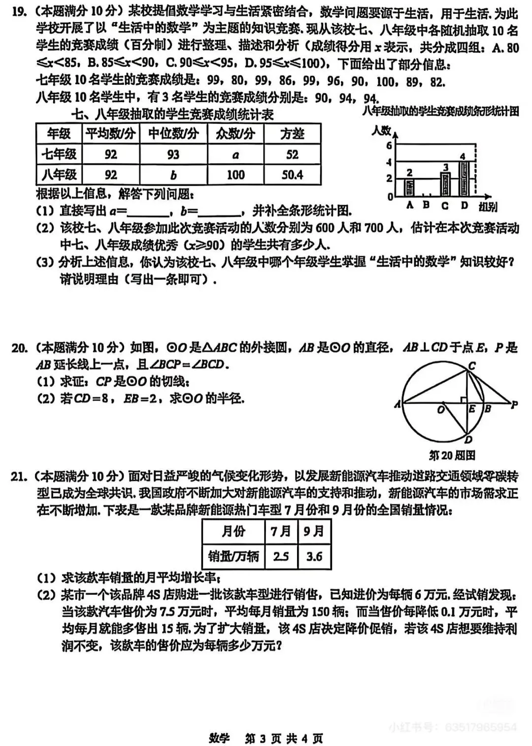 九年级学情质量检测数学试卷及答案