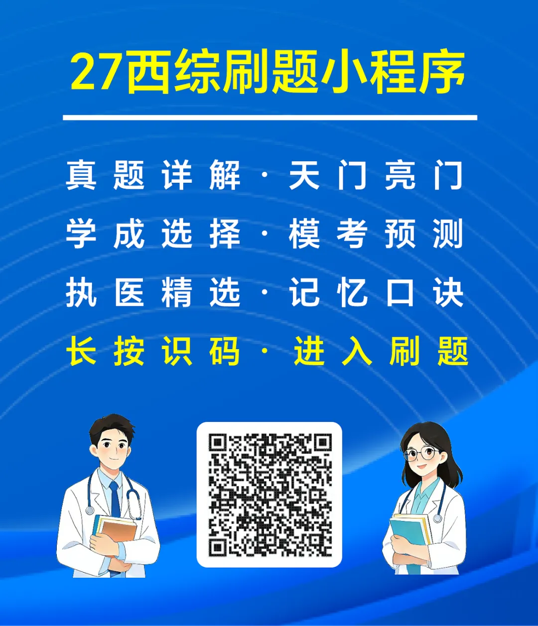 包含近30年西综真题,逐题逐项超详解析。我们在参考权威教材及辅导书的基础上,又独家进行了详细的补充说明,解析分为【精简版】和【详细版】,以点带面横扫知识点,满足不同学习层次的用户需求,保证是市面上西综真题解析最详细的。解析分为四块内容,学霸笔记+思维导图+讲义内容+超详解析,实现全方位解析,能够充分满足天门学子的刷题需求。我们比其他西综小程序解析更全面,保证每一道题目都有相应的解析,不会出现虎头蛇尾的这种情况。解析分为四块内容,学霸笔记+思维导图+讲义内容+超详解析,实现全方位解析,能够充分满足亮门学子的刷题需求。其他西综小程序有天门题库,没有亮门题库,我们都包含。解析全面,保证每一道题目都有相应的解析,帮助学生吃透知识点。解析分为三块内容,逐题逐项文字详解+思维导图+讲义内容。目前西综考研竞争越来越激烈,都在冲刺高分。学生已不满足于只刷西综真题。学成选择题已经是众多西综考研学生的必刷题型。27西综小程序上的学成选择题,每个科目每个章节全覆盖,题目丰富且全面。解析里面除了加相应的名师版思维导图和讲义内容。我们还在参考权威教材及辅导书的基础上,又独家进行了详细的逐题逐项文字解析,帮助考研学生吃透知识点,这是市面上其他同类小程序根本就没有的,也是我们这个西综小程序的一大亮点。5. 各大模考预测卷(27\26\25考研全都有)买一年题库,刷三年试题!如果只有西综真题,那么这个题库是司空见惯,平平无奇的。市面上每年还有很多的万人模考卷和冲刺预测卷,我们将常见的试卷都录入到了题库当中,且每套试卷都增加了考试模式。海量试题,让大家在一个地方花最少的价钱,既能吃饱又能吃好。没有解析的试题就是耍流氓!这些试题市面上有解析的,我们有;市面上没有文字解析的,我们也有!我们在参考权威教材及辅导书的基础上,独家进行了详细的逐题逐项文字解析,帮助考研学生吃透知识点。其中天门试卷,解析分为两块内容,文字详解+天门学霸笔记,保证每一道题目都有相应的解析,能够充分满足天门学子的刷题需求。文字详解是市面上其他同类小程序根本就没有的,也是我们这个西综小程序的一大亮点。现在西综考研越来越偏向临床、病例题占比高、整体难度提升,考点和执业医师内外科高度重合。执医真题临床思维强、病例规范,能帮助练诊疗思路、补齐临床细节,夯实内外核心考点,和考研真题互补,适配最新命题趋势,对提分、应对难题很有必要。解析分为两块内容,文字详解+学霸笔记,保证每一道题目都有相应的解析。执医真题精选市面上是没有文字解析的,我们在参考权威教材及辅导书的基础上,又独家进行了详细的逐题逐项文字解析。西综知识点繁杂易混,记忆口诀能化繁为简,快速锁定核心考点、鉴别要点与关键数值,省去死记硬背的麻烦。能帮助突破易混淆难点,大幅提升记忆效率与刷题正确率,节省背诵时间,高效巩固知识,助力冲刺提分。目前主要配套的是天门题库,含各科分章节,采用刷题模式,牢记西综记忆口诀!之后其他的记忆口诀也会逐步完善进来。27西综刷题小程序里面,还赠送27考研政治题库(待更新):历年真题+冲刺预测+各大名师(肖涛腿修米吉石孔余曲苏杨)