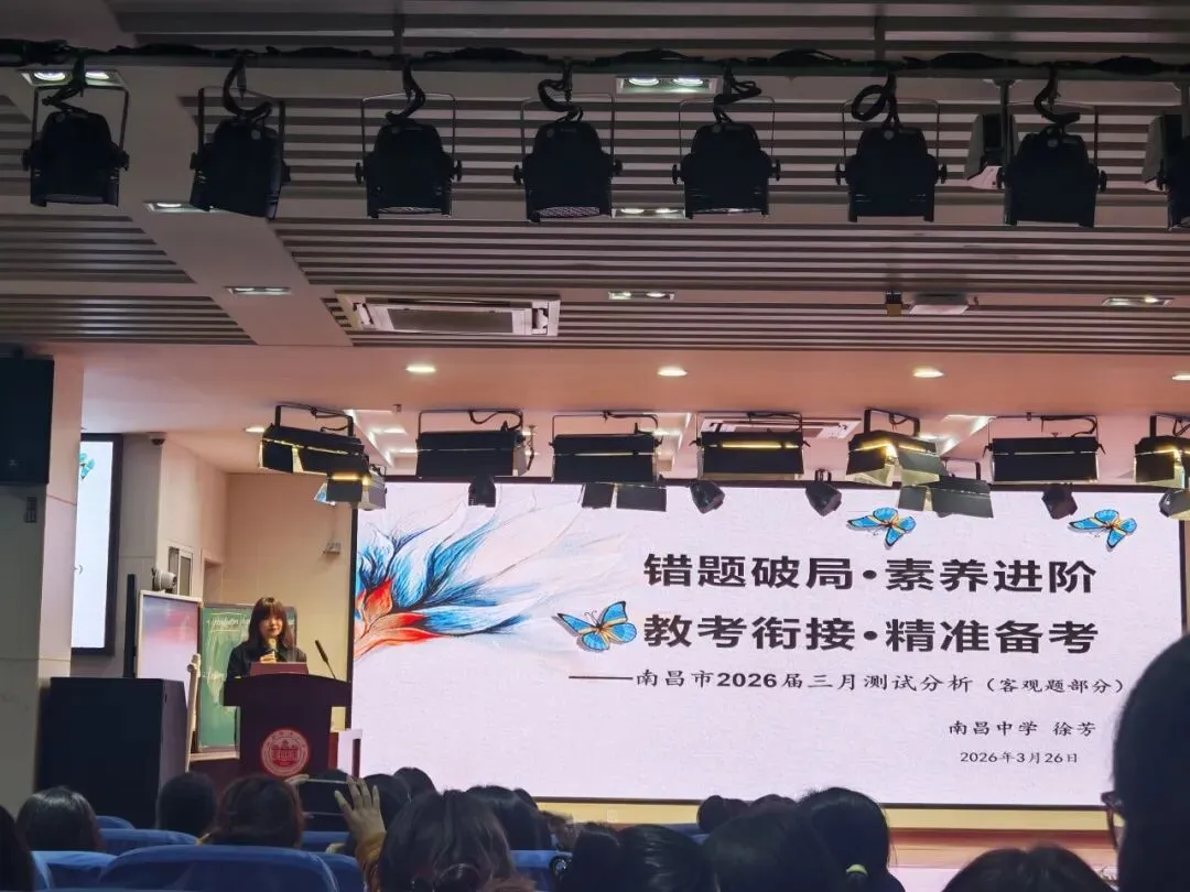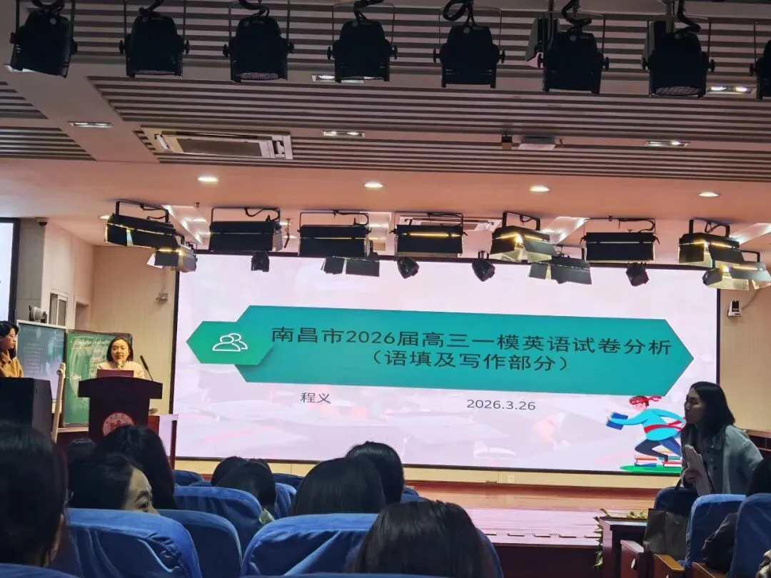 为精准剖析2026届南昌市高三英语一模试卷命题规律,破解二轮复习教学难点,明确备考方向,2026年3月26日下午2:00-4:00,由新建二中承办的“南昌市2026届高三英语一模试卷分析暨二轮复习研讨活动”在学校阶梯教室顺利开展。南昌市教研员熊姿老师、江西省南昌市新建区第二中学副校长刘善来同志莅临指导,全市各高中英语教师齐聚现场,以课例展示、评课研讨、专题讲座为核心环节,共研备考策略,共探教学路径。