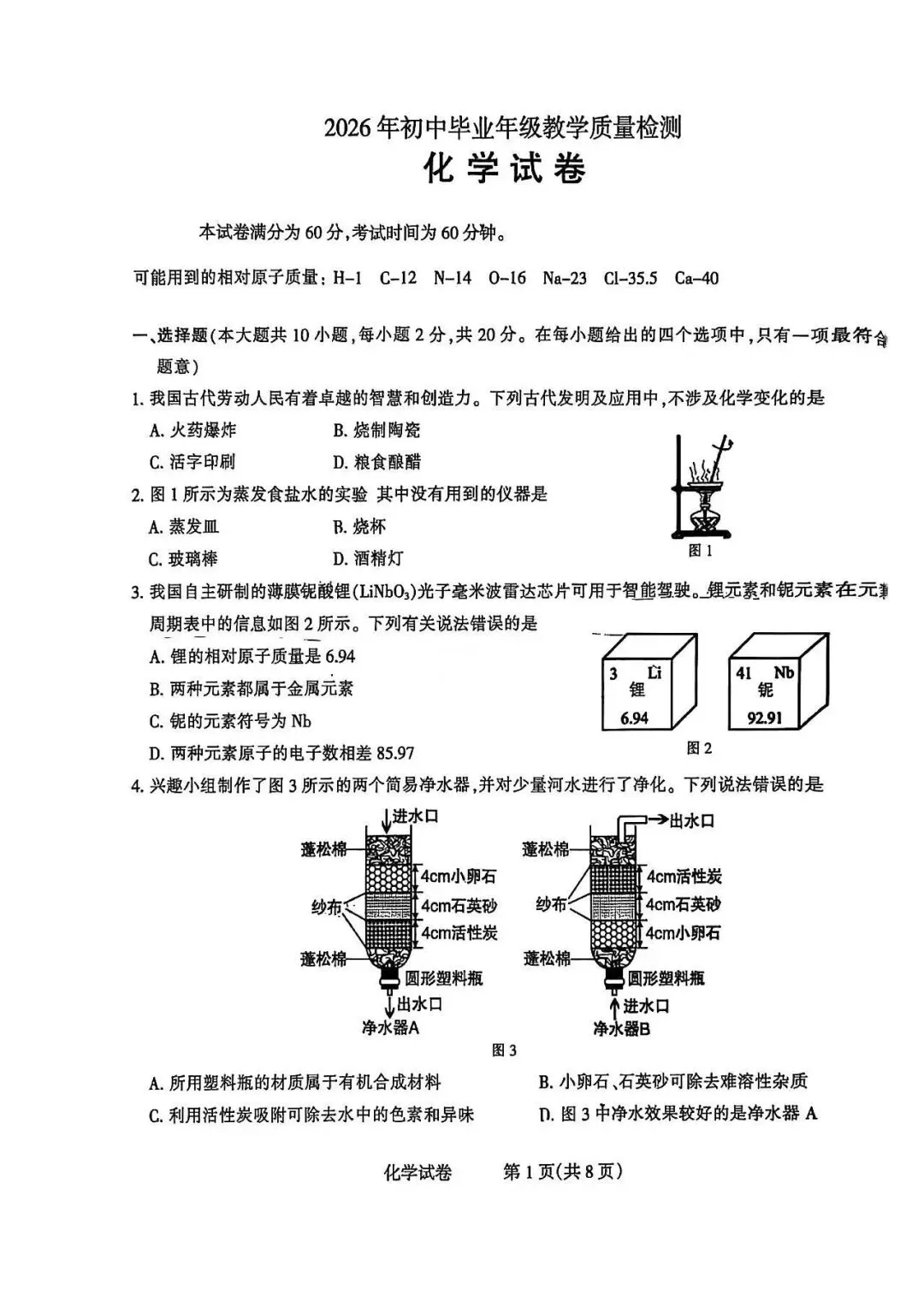 2026年初中学业水平测试模拟演练一化学试卷