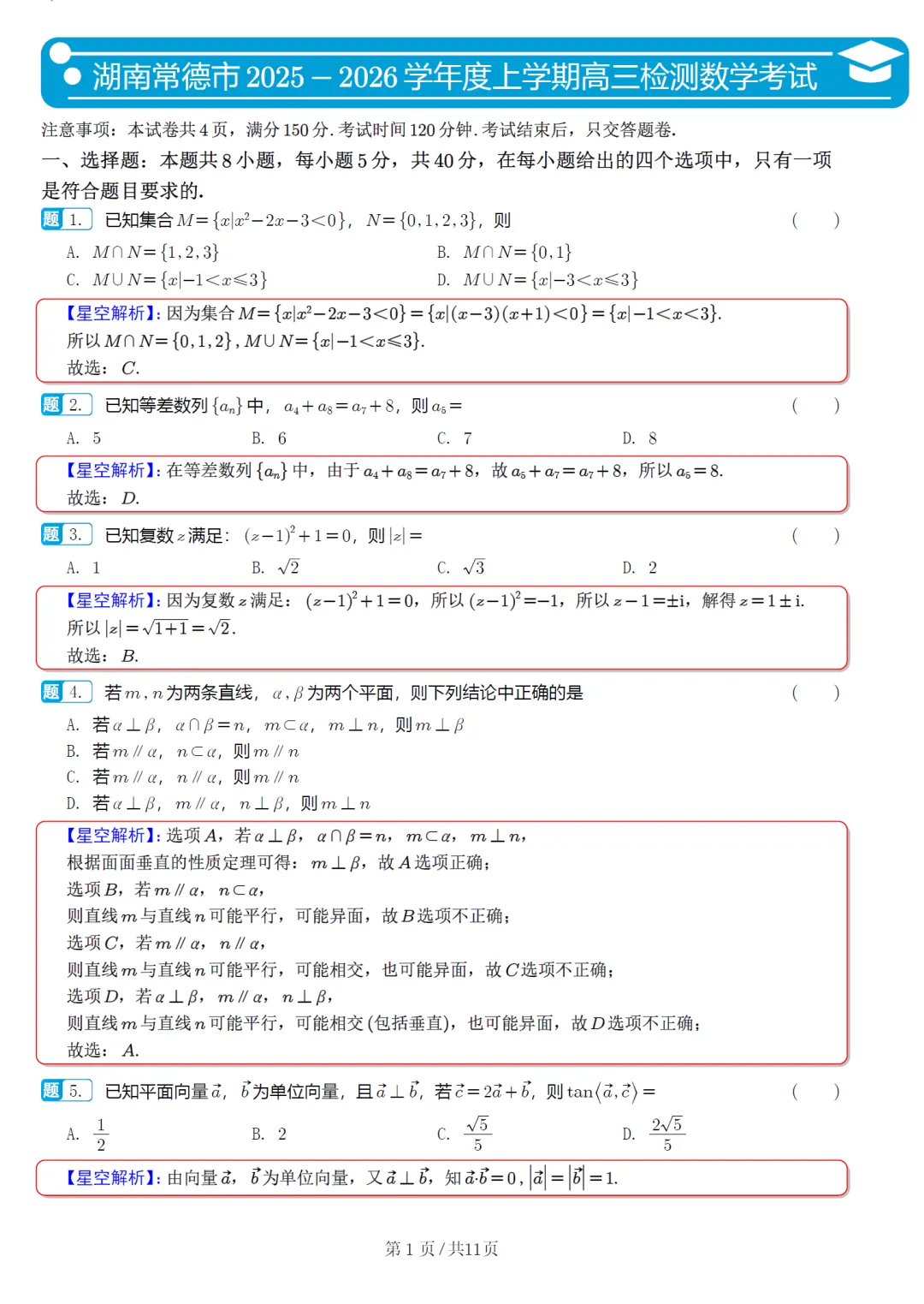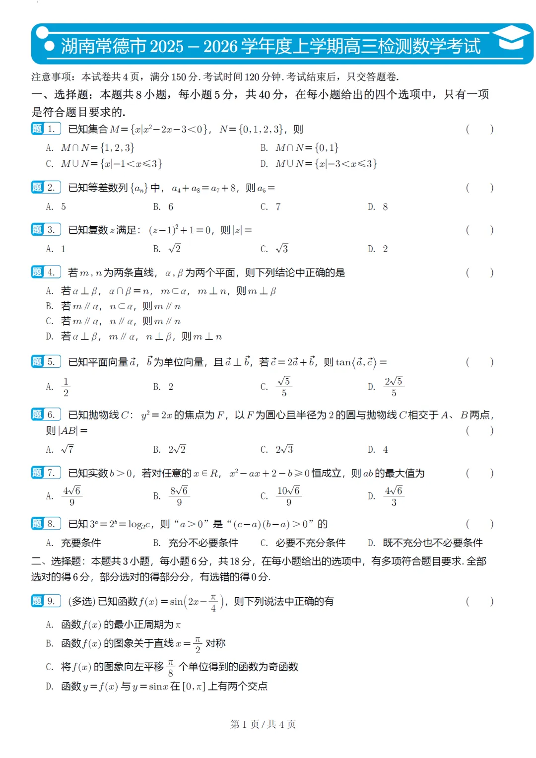 134.2026届湖南省名校高三联考数学试卷及逐题解析(2025.11)
