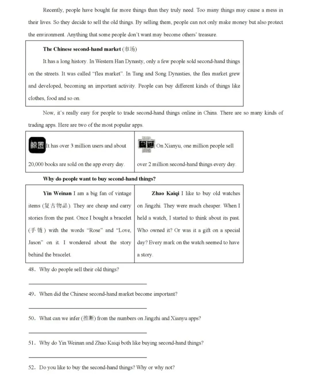 50. The second-hand trading apps are popular in China./More and more people trade online.