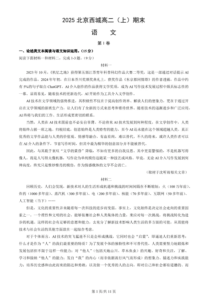 >2025北京西城高二上册期末语文试卷(有答案)【可下载】