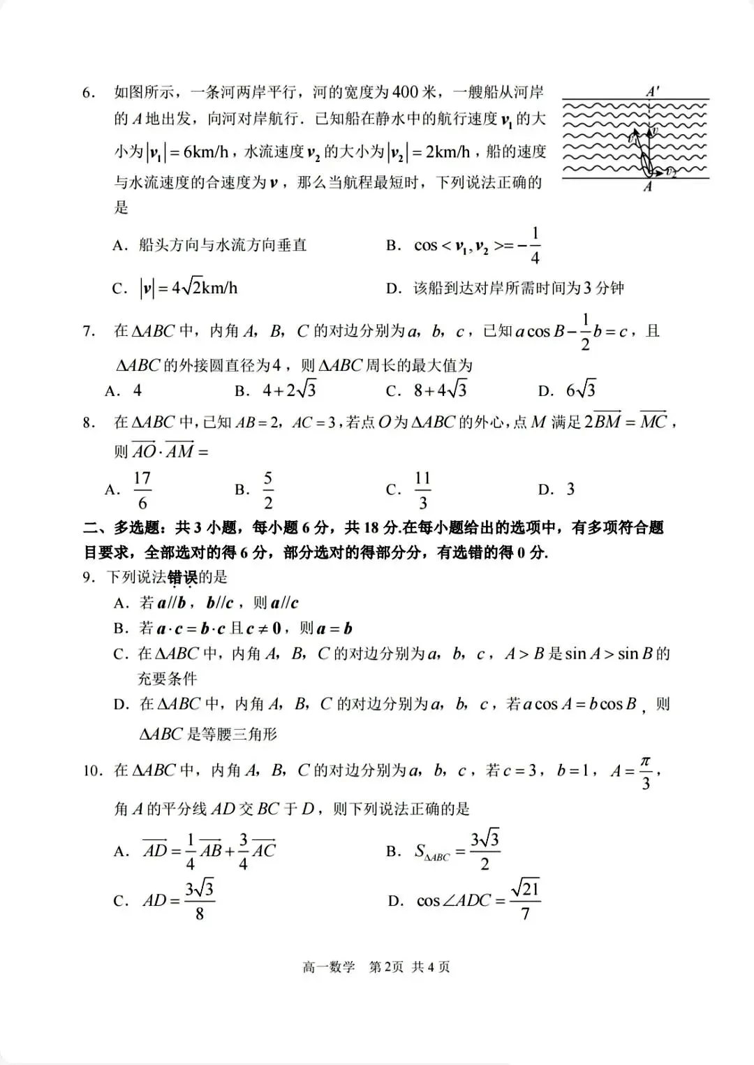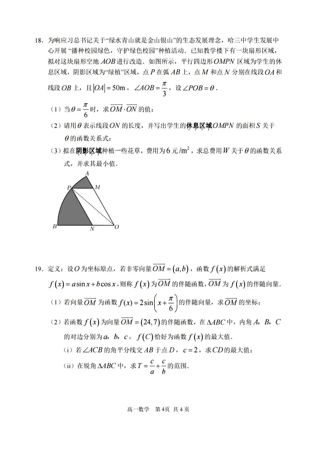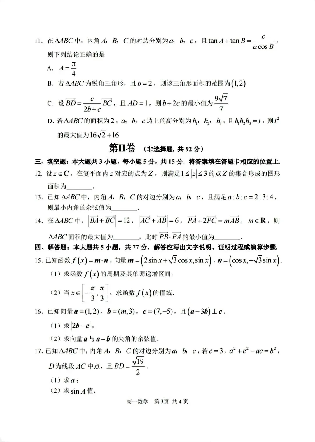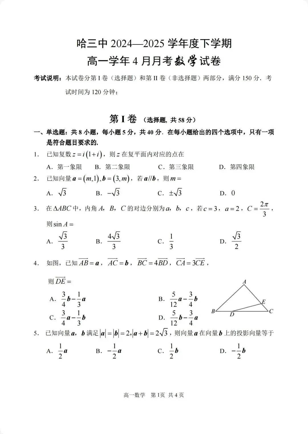 2425学年哈三中高一下数学4月月考试卷