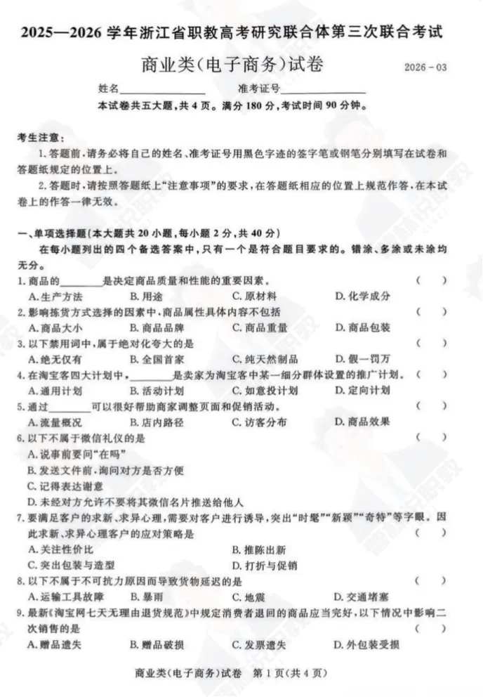 为了方便孩子复习备考,我们特意整理了浙江省职教高考研究联合体第三次联合考试试卷-商业类(电子商务)+答案解析,现在免费分享给大家~