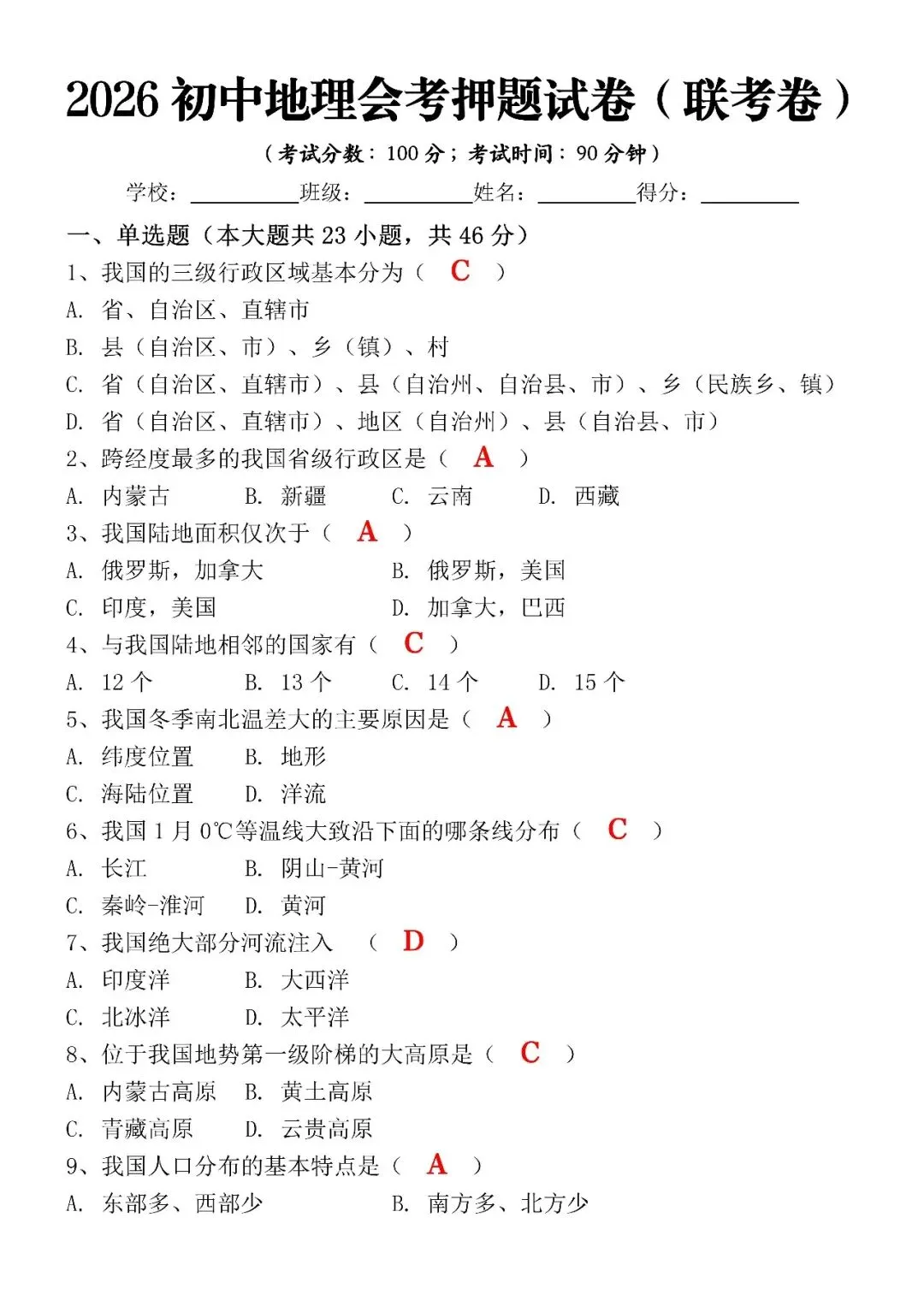 >2026初中地理会考押题试卷(联考卷)(含答案),电子版可打印!