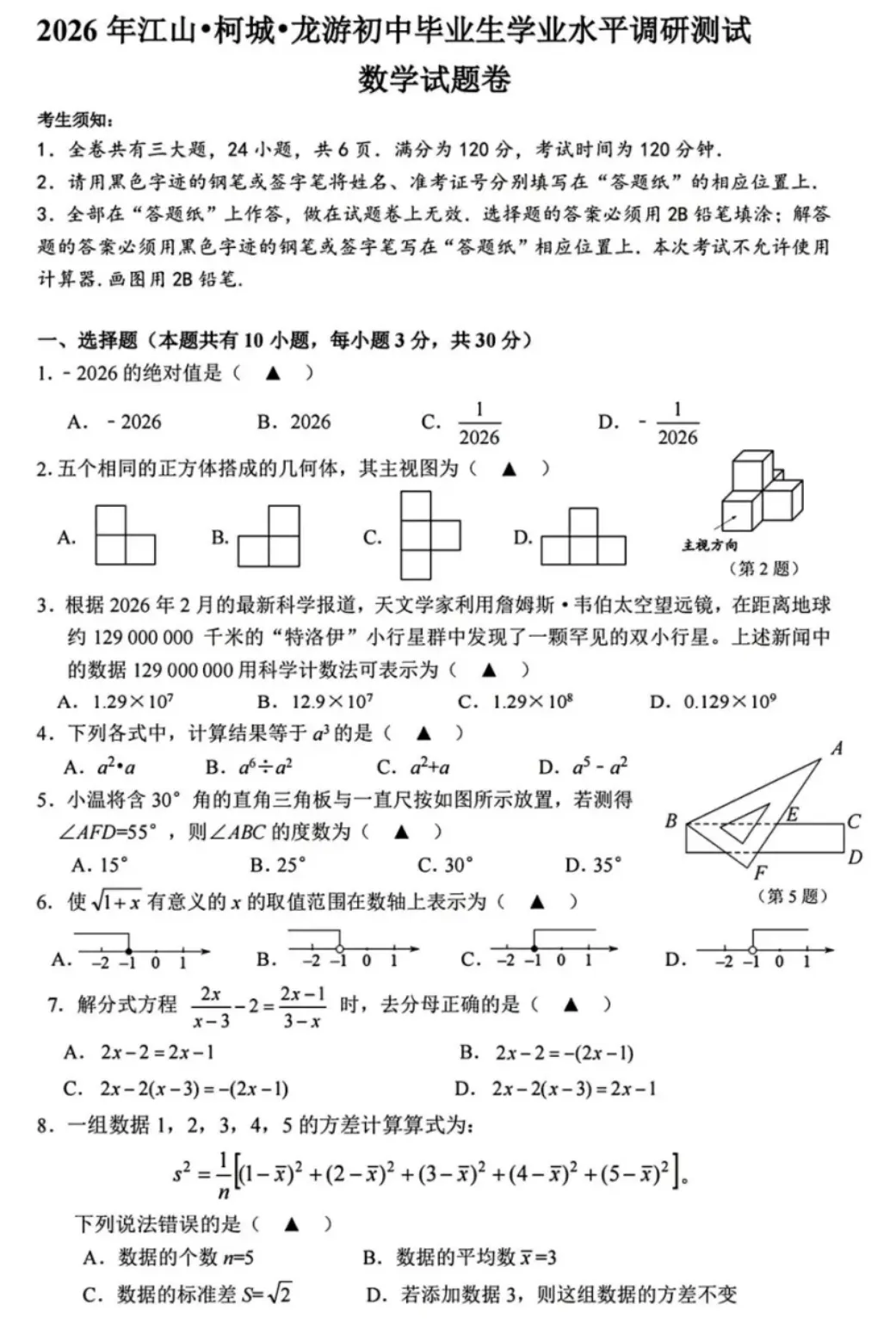 【2026浙江中考模拟数学试卷】衢州市江山市中考一模数学试卷(2026.3)
