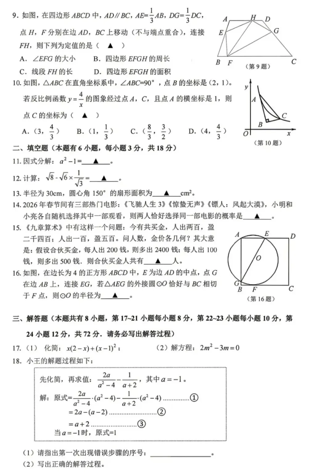 >【2026浙江中考模拟数学试卷】衢州市江山市中考一模数学试卷(2026.3)